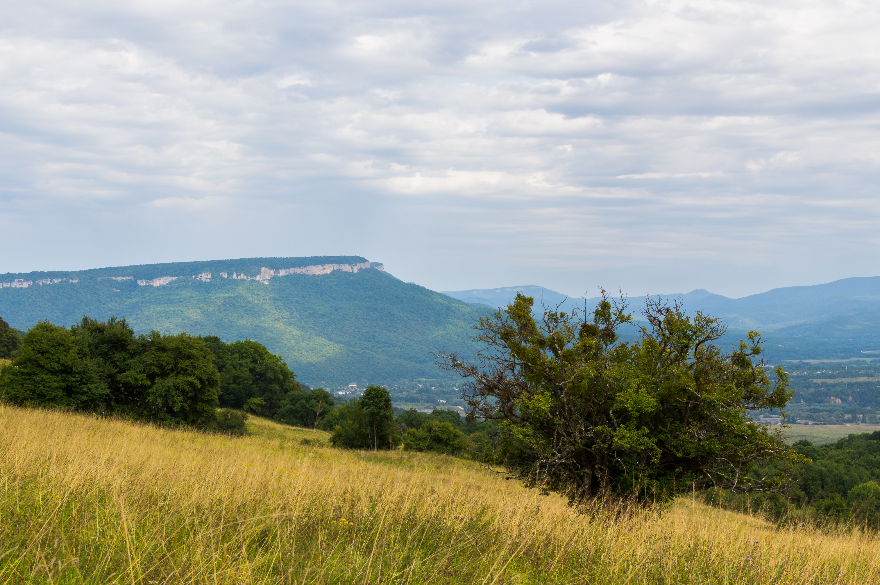 Вдали, за лесом, простирается живописная долина, окутанная легкой дымкой. Ее очертания размыты, что создает ощущение бесконечности и простора. На горизонте возвышаются величественные горы с плоскими вершинами, их силуэты отчетливо видны на фоне переменчивого неба. Облака, плывущие по небу, добавляют динамики и драматизма, создавая игру света и тени на горных склонах.