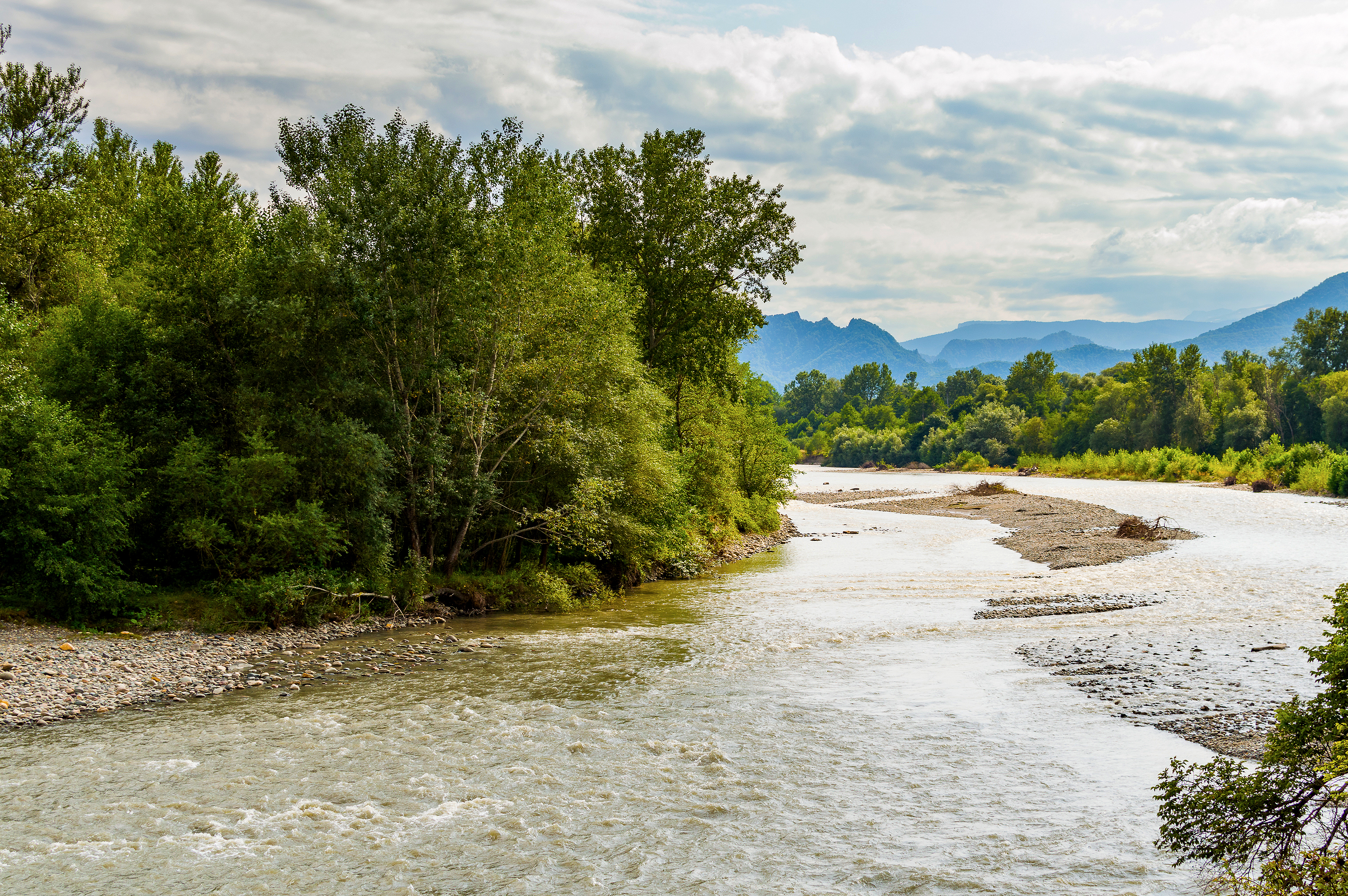 Этот завораживающий пейзаж приглашает зрителя окунуться в атмосферу умиротворения и величия природы. Широкая, полноводная река, воды которой мерцают под легкими облаками, извивается, прокладывая путь сквозь густую, изумрудную зелень. Берега реки украшены камнями и галькой, свидетельствующими о ее силе и постоянном движении. Слева раскинулся плотный массив деревьев и кустарников, их листва играет оттенками зеленого, создавая ощущение жизни и свежести. На заднем плане возвышаются величественные горы, их силуэты мягко растворяются в легкой дымке, придавая пейзажу глубину и загадочность. Небо, покрытое легкими, перистыми облаками, добавляет драматизма и подчеркивает масштабность сцены. Солнечные лучи, пробиваясь сквозь облака, освещают водную гладь и зелень, создавая игру света и тени. Эта композиция передает ощущение спокойствия, гармонии и нетронутой красоты дикой природы, идеально подходя для создания атмосферы умиротворения и отдыха.