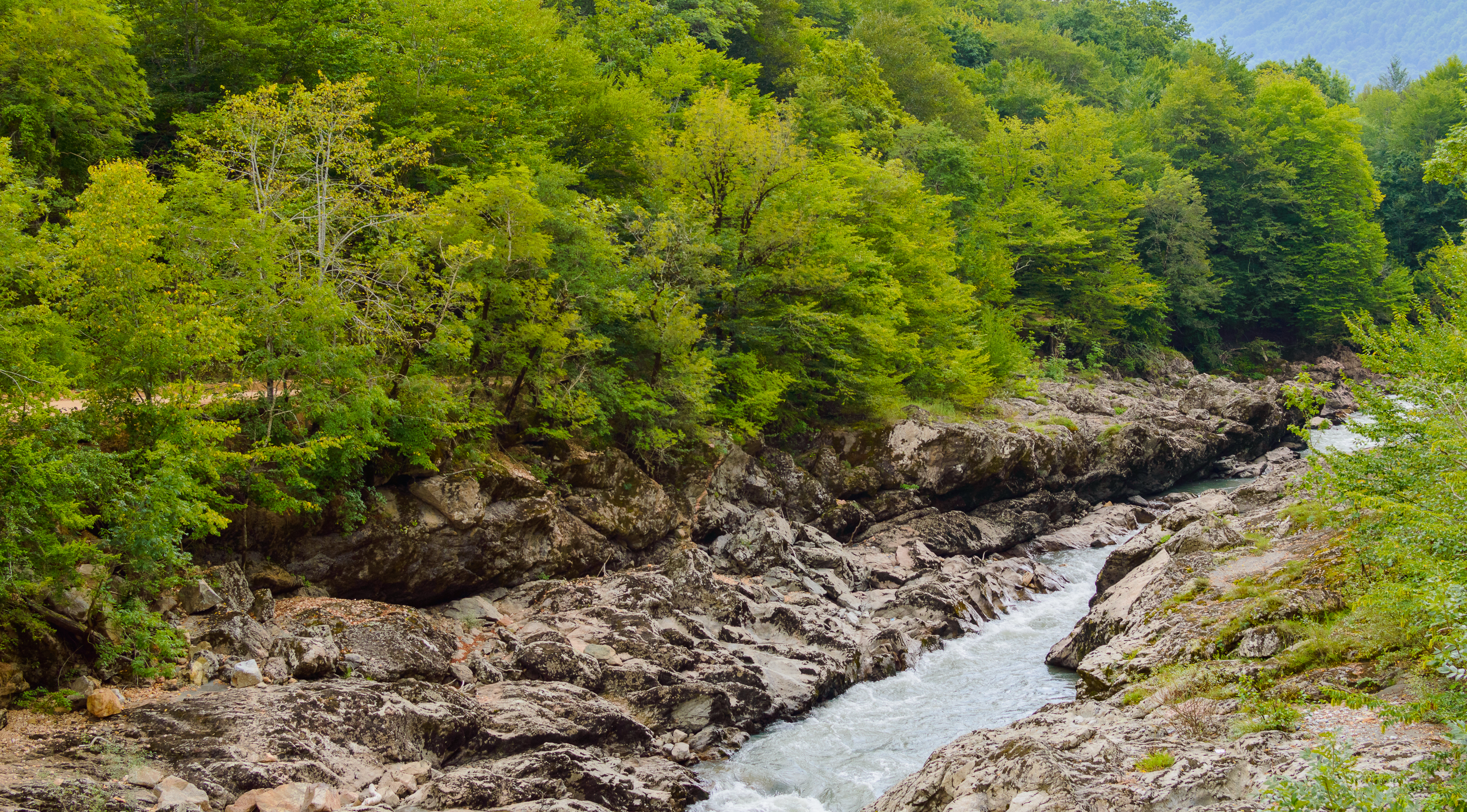 The photograph transports us to the heart of wild, untouched mountains, where a swift river carves its way through massive, time-worn rocks. This is a place where nature reigns supreme, creating a truly breathtaking spectacle. The lush greenery of the dense forest covering the slopes contrasts with the gray and beige tones of the stones, creating a picturesque palette.