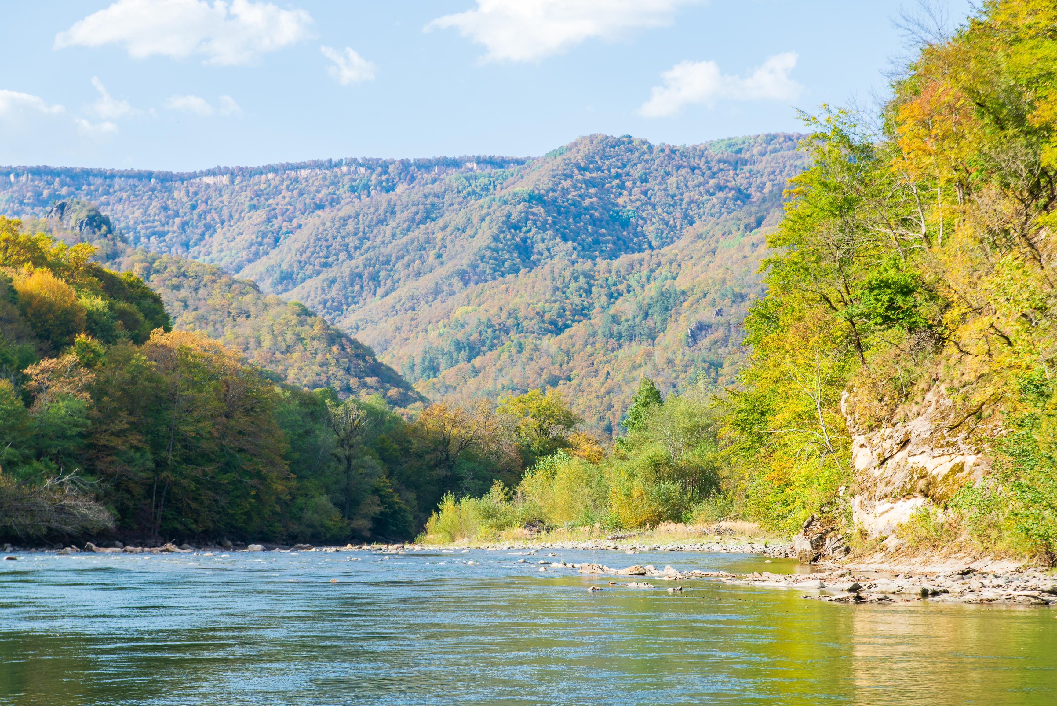 The scene is rich in texture — from the smooth, reflective surface of the river to the rough, weathered bark of ancient trees and the soft, velvety appearance of autumn leaves. The color palette shifts dynamically across the frame: cool blues dominate the water and sky, contrasting with fiery yellows, deep greens, and earthy browns in the foliage and rocky terrain. The lighting is natural daylight, casting an even glow that enhances depth without harsh contrasts. This wide-angle shot captures both foreground elements like riverbanks and distant vistas of layered mountain ridges, creating a sense of scale and immersion.