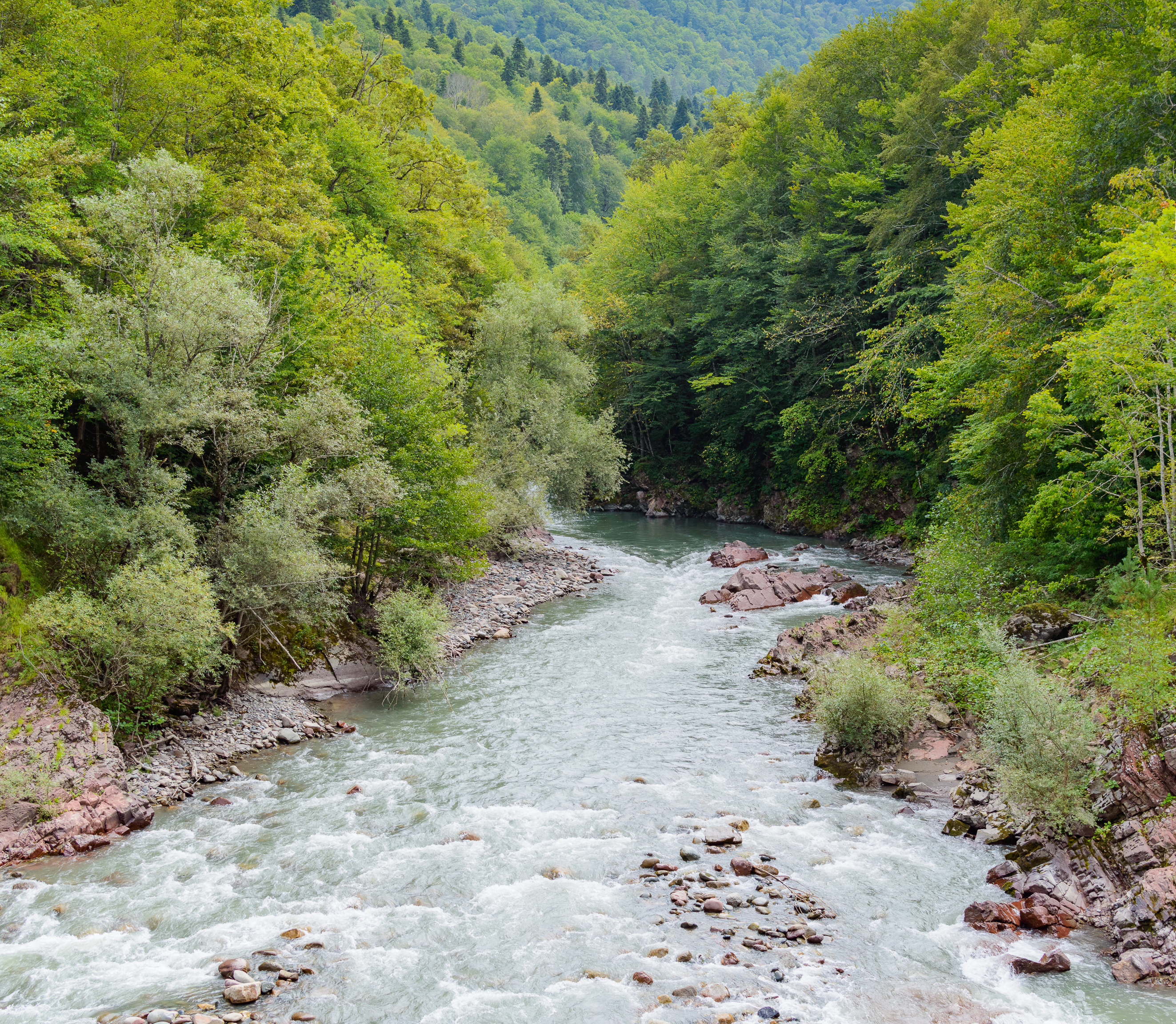 The riverbanks are strewn with large boulders and rocky outcrops, which serve as a natural frame for the flowing water. The variety of green hues, from bright lime to deep forest green, showcases the richness of the flora in this mountainous region. The air here seems filled with the freshness and aroma of pine needles and damp earth.