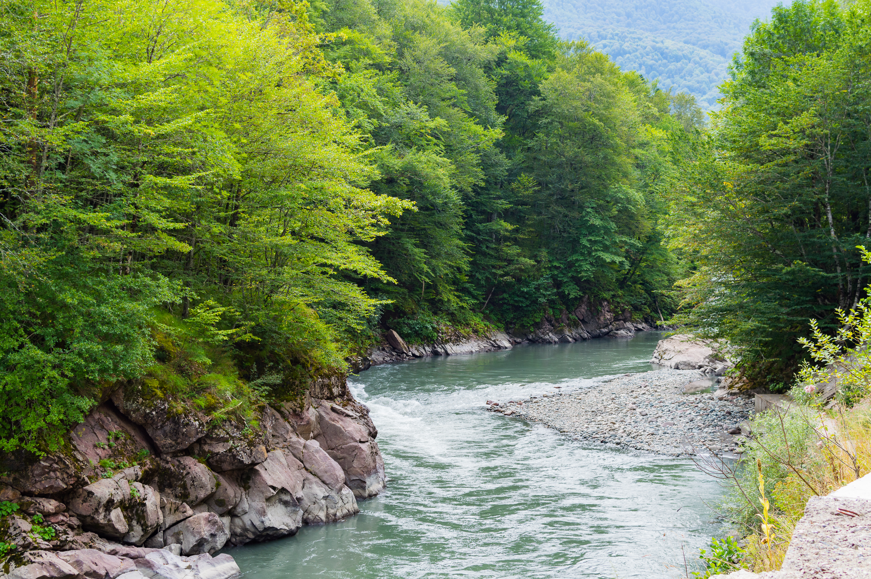 Эта фотография переносит зрителя в самое сердце нетронутой природы, где могучая горная река стремительно несет свои воды сквозь густой, изумрудный лес. Снимок, вероятно, сделан в летний или ранний осенний день, когда зелень деревьев достигает своего апогея, а погода, судя по мягкому, рассеянному свету, скорее всего, облачная или пасмурная, что смягчает тени и подчеркивает богатство оттенков листвы.