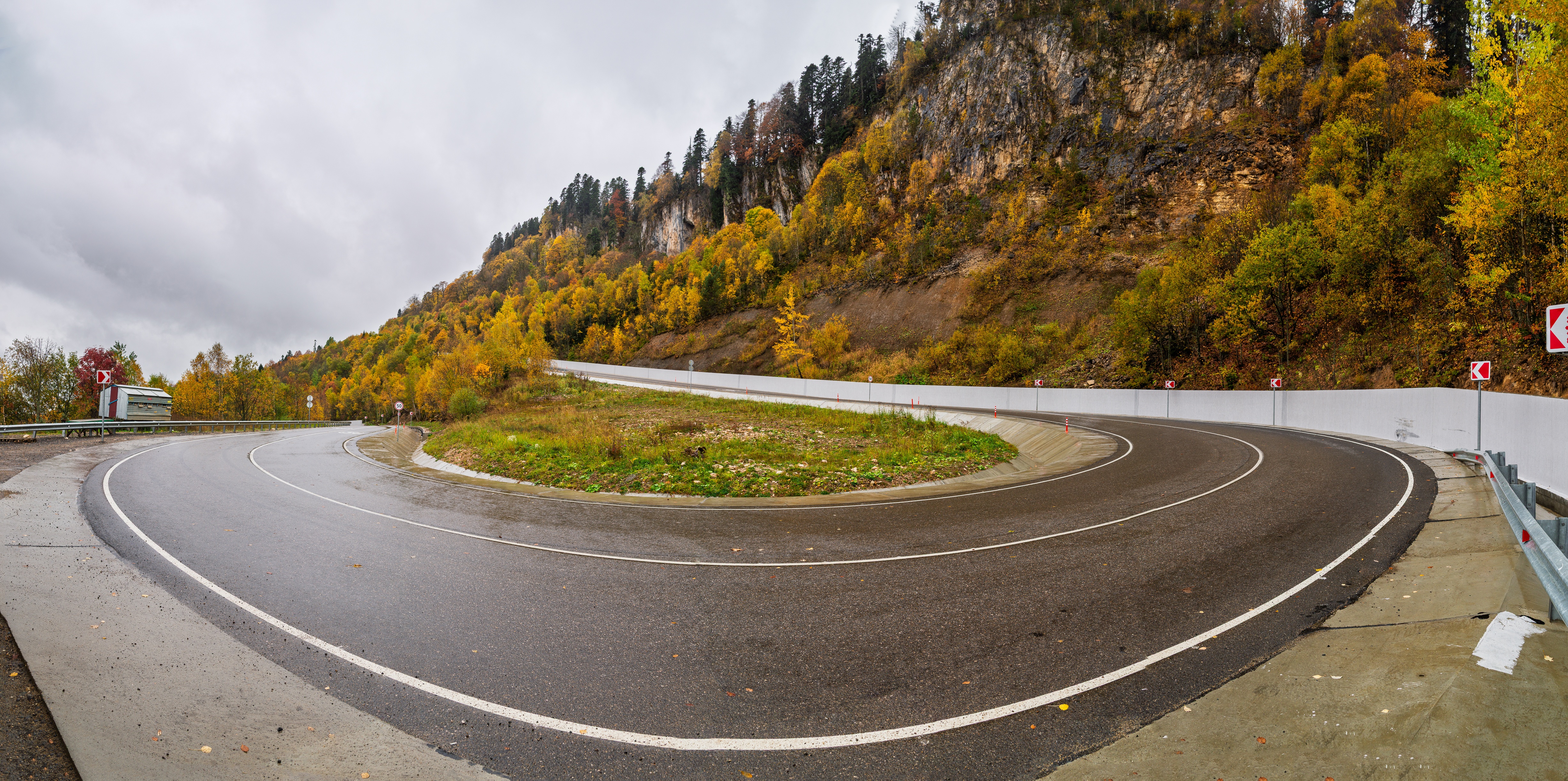 The image presents a panoramic view of a winding mountain road cutting through autumnal hills. The road, bordered by white guardrails, curves gracefully into the distance, creating a sense of motion and depth. Trees on the slopes display vibrant hues of yellow, orange, and green, contrasting with grey cliffs and an overcast sky. A small grassy patch in the center serves as a visual anchor. The scene evokes a feeling of serene isolation within nature, where human presence and machinery harmoniously blend with the majestic landscape.