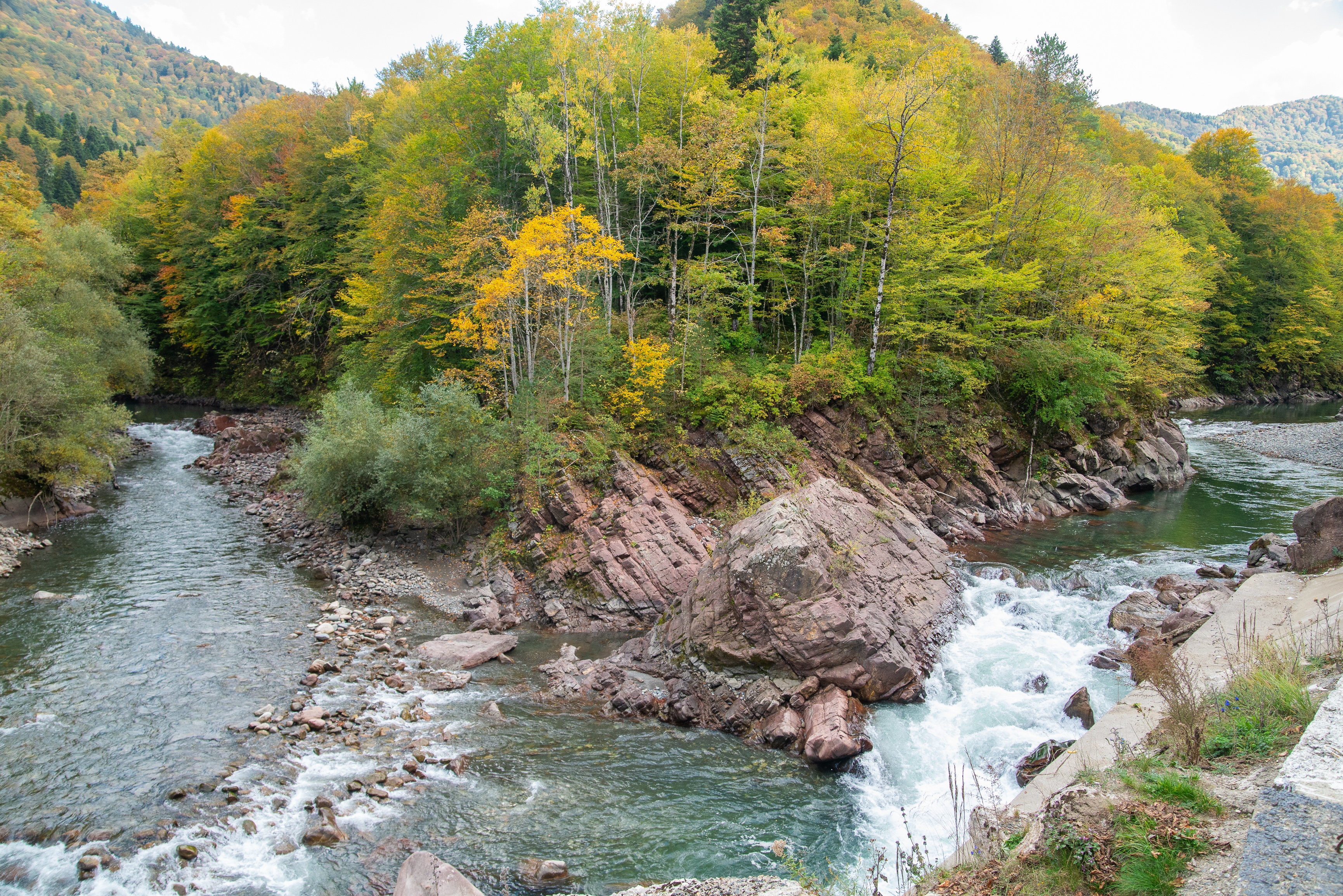Compositionally, the shot is arranged so that the viewer's gaze involuntarily follows the flow of the river, receding into the distance, towards the mountain peaks shrouded in a light haze. The central element, attracting attention, are the rocky outcrops that divide the river into several streams and create picturesque waterfalls. The texture of the rocks is diverse: from smooth, polished by water, to rough, covered with moss and lichens. The color palette of the image is rich and saturated: deep shades of green, bright yellow and orange foliage colors, gray and reddish tones of the rocks, as well as clear blue water with sky reflections. The lighting is natural, soft, characteristic of a cloudy autumn day, but it only emphasizes the depth of colors and the volume of objects. Light plays on the water surface, creating shimmering highlights, and shadows from trees and rocks add contrast and drama to the image. The detail is worked out at a high level, allowing you to see the structure of the foliage, the relief of the rocks, and the movement of the water.