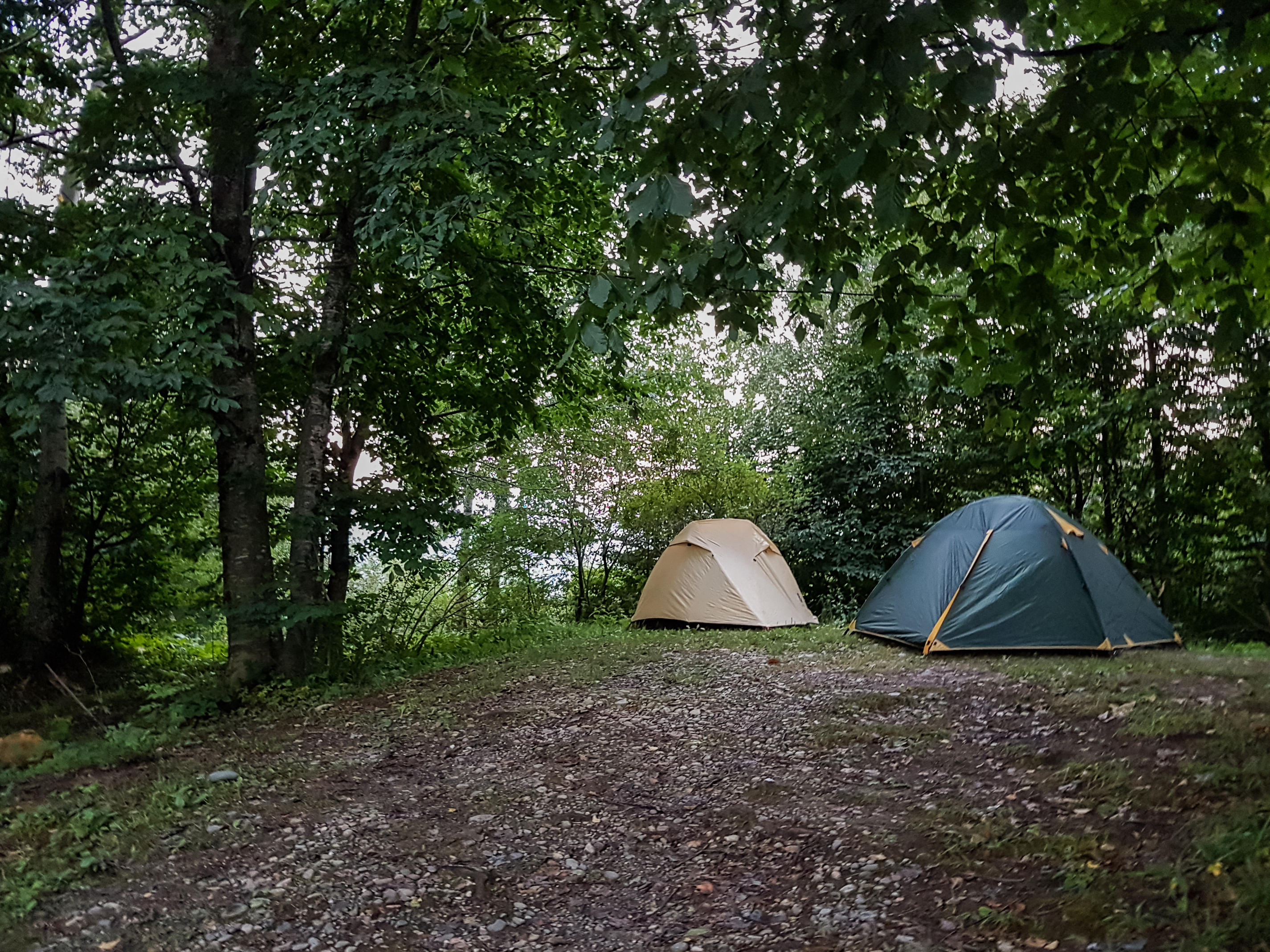 This picturesque photograph transports the viewer into the heart of a dense green forest, where two tourist tents are cozily set up in a small clearing. One tent is in light, sandy tones, while the other is a deep dark green, contrasting with the surrounding greenery. The ground beneath the tents is covered with gravel and fallen leaves, adding realism and a sense of wild nature.