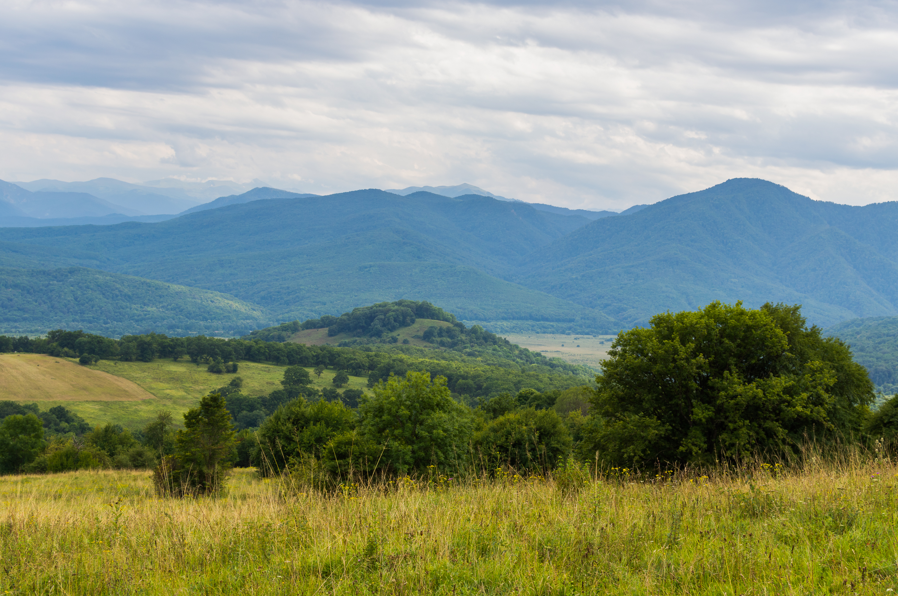 Далее взгляд скользит по холмистой местности, где чередуются изумрудные луга и густые зеленые леса, покрывающие склоны. Вдалеке виднеются величественные горные хребты, окрашенные в нежные голубые оттенки, что создает ощущение бескрайнего простора и величия природы. Горы уходят вдаль, сливаясь с небом, их контуры становятся мягче и размытее, создавая эффект воздушной перспективы.