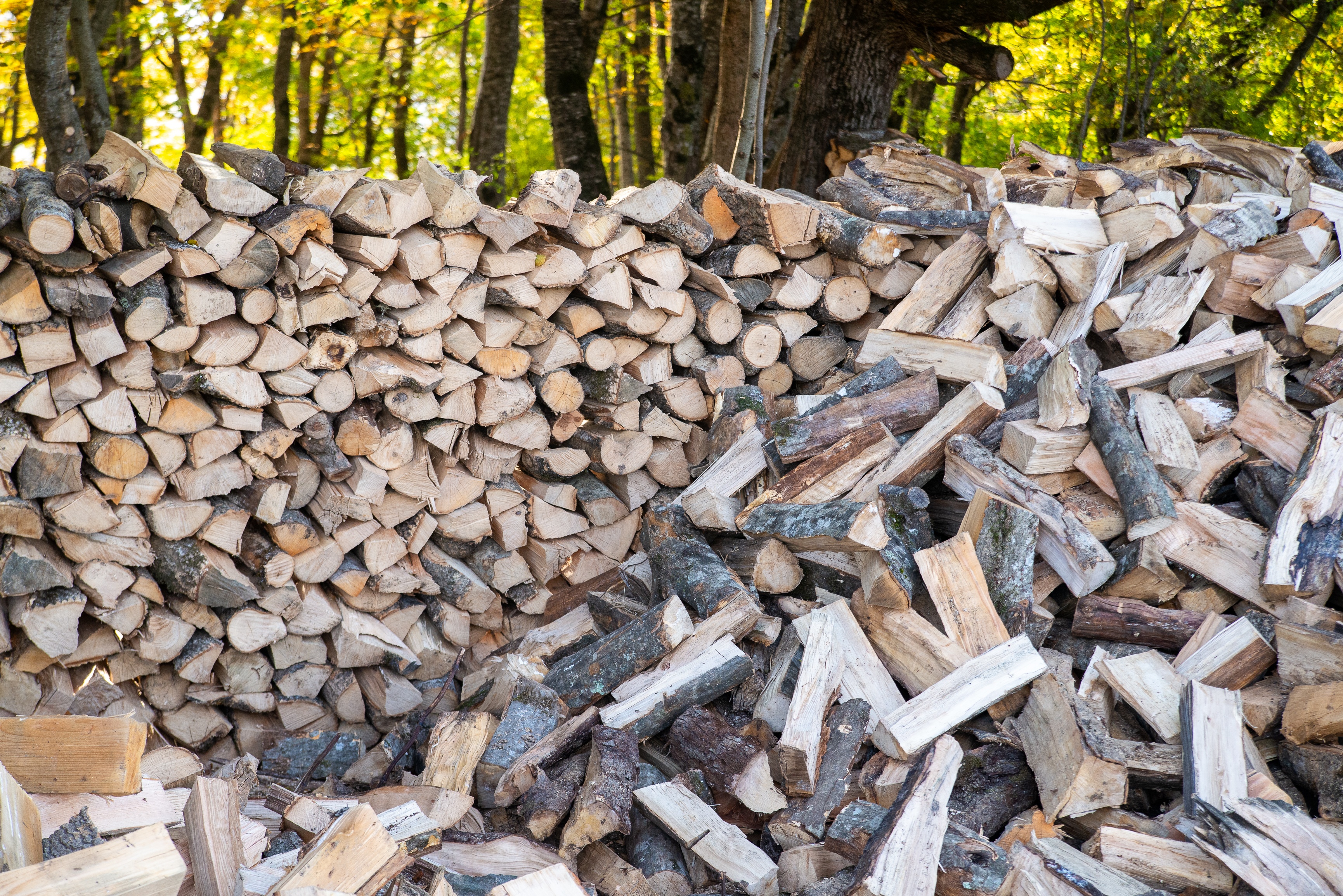 This image captures a meticulously stacked pile of firewood in the heart of a sunlit forest, evoking a sense of rustic tranquility and seasonal preparation. The logs are arranged with precision on one side while loosely piled on the other, showcasing natural wood grain patterns and varied tones ranging from pale beige to deep brown. Behind the woodpile, tall tree trunks rise against a backdrop of vibrant autumn foliage, bathed in warm sunlight filtering through the canopy. The composition emphasizes texture and contrast: smooth cut surfaces juxtaposed with rough bark edges, while dappled light enhances depth and dimensionality.