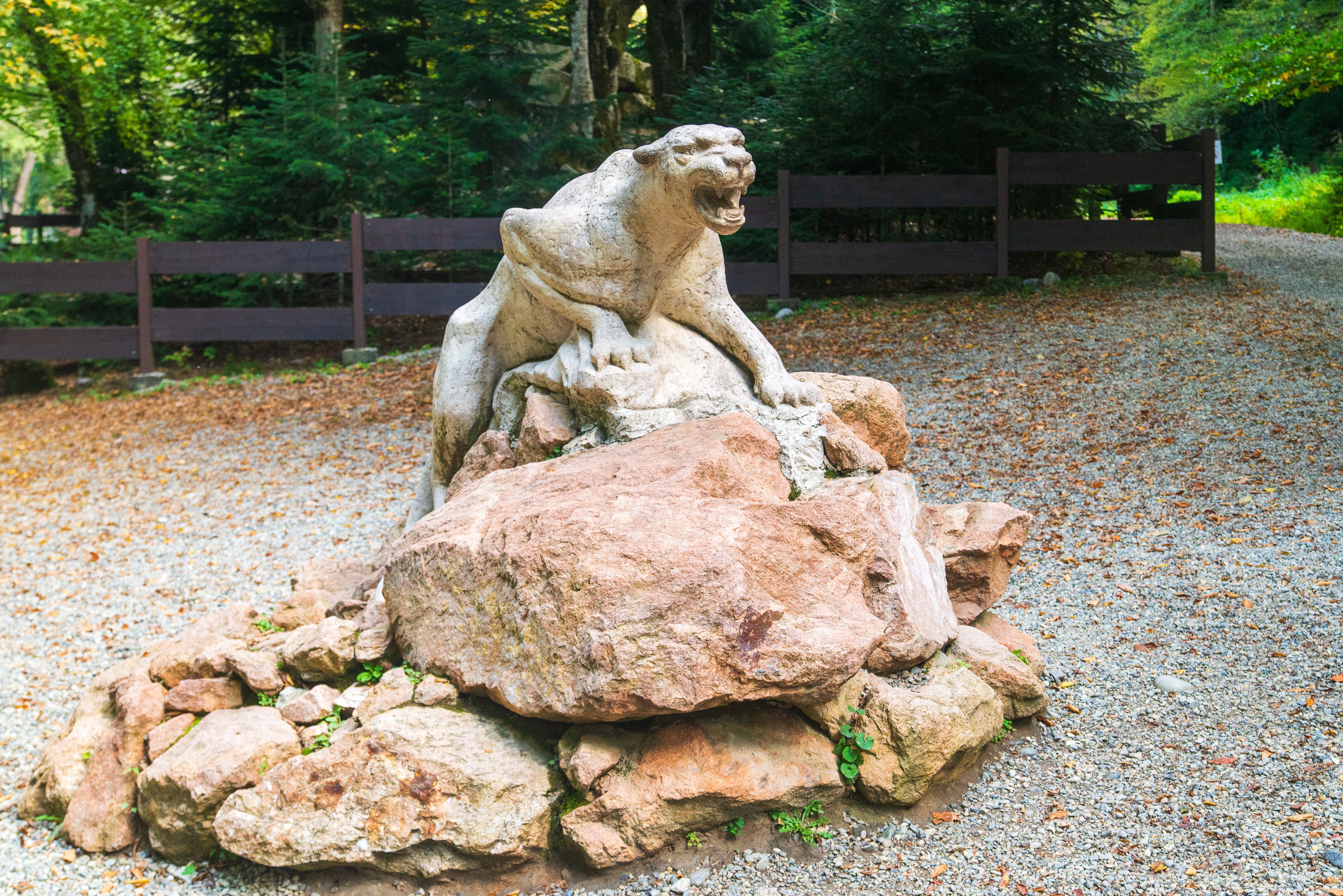 Это захватывающее изображение запечатлевает мощную каменную статую леопарда, устроившегося на естественной скальной конструкции внутри спокойного лесного парка. Окружающий ландшафт состоит из густых зеленых деревьев и деревянных ограждений, которые мягко обрамляют композицию, усиливая ее сельский шарм. Гравийная дорожка, ведущая к статуе, приглашает зрителя погрузиться в эту умиротворяющую атмосферу — идеальное место для размышлений или приключений. Мягкий дневной свет окутывает сцену теплыми тонами, подчеркивая текстуру как каменной статуи леопарда, так и окружающих скал.
