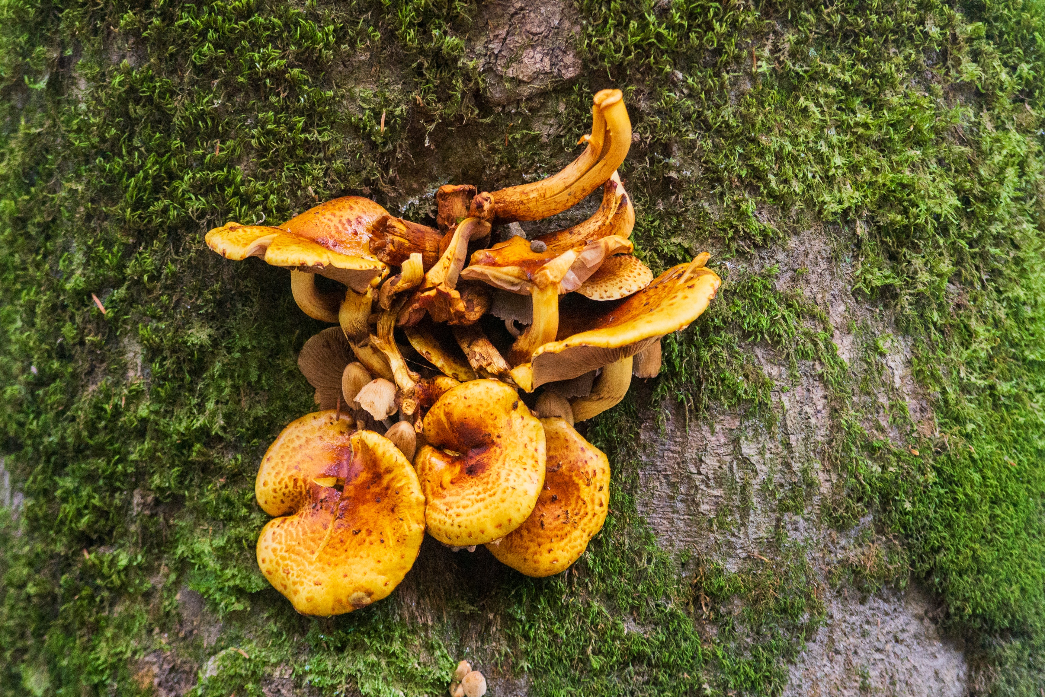 The composition is tightly framed around the fungal colony, emphasizing their intricate forms—some caps curling upward like delicate trumpets while others lie flat and bulbous. The rough texture of the tree bark provides a rugged backdrop to the soft, velvety appearance of the moss and mushrooms themselves. Soft, diffused light filters through the canopy above, illuminating the scene evenly without harsh shadows, highlighting every pore on the mushroom surfaces and every strand of moss.