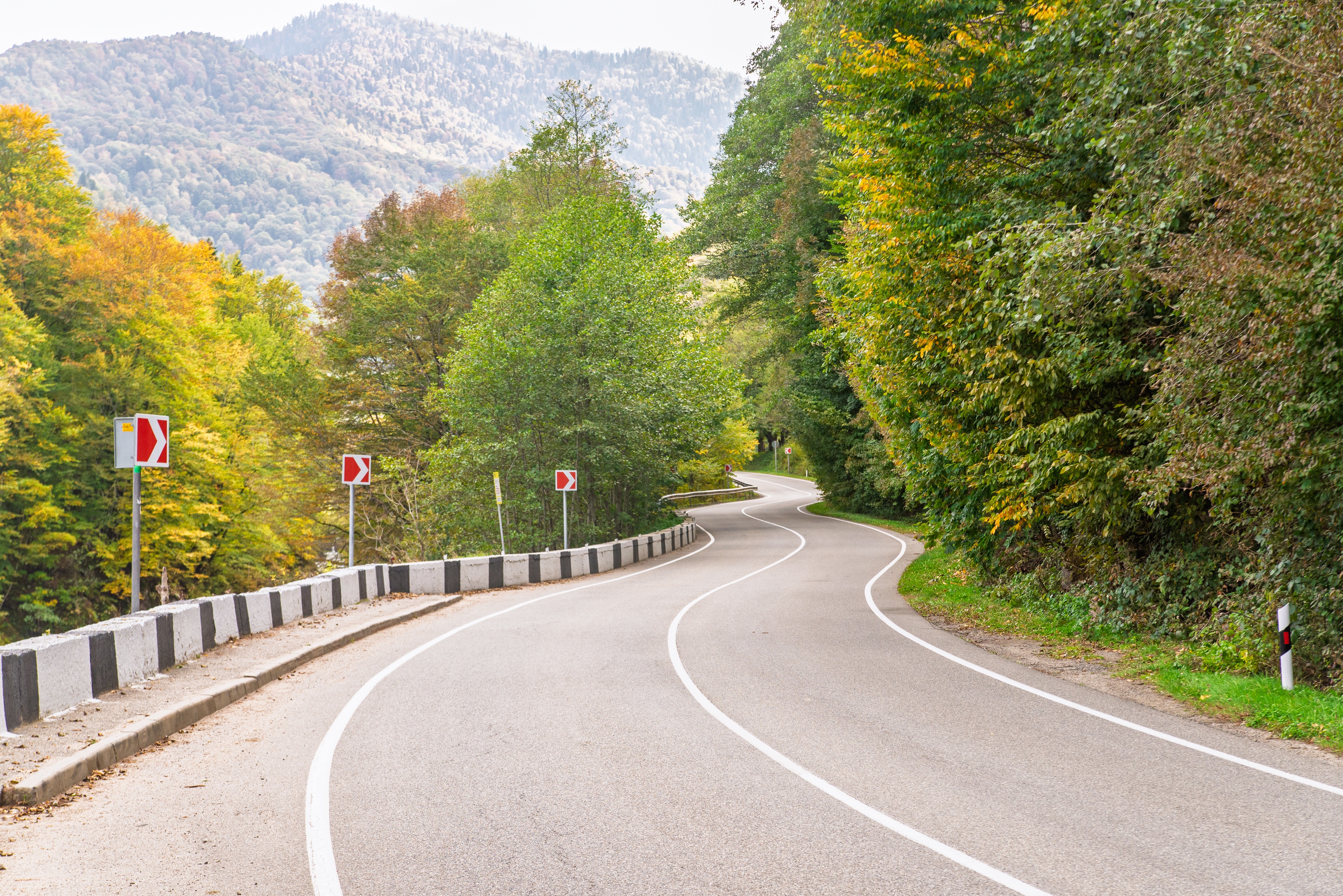Это захватывающее изображение представляет собой извилистую горную дорогу в Адыгее, окруженную густым осенним лесом. Асфальтовая поверхность плавно изгибается по долине, обрамленная яркими деревьями с насыщенными оттенками зелени, желтого и оранжевого. Вдали возвышаются величественные горы с покрытыми снегом вершинами, создавая восхищающий фон.