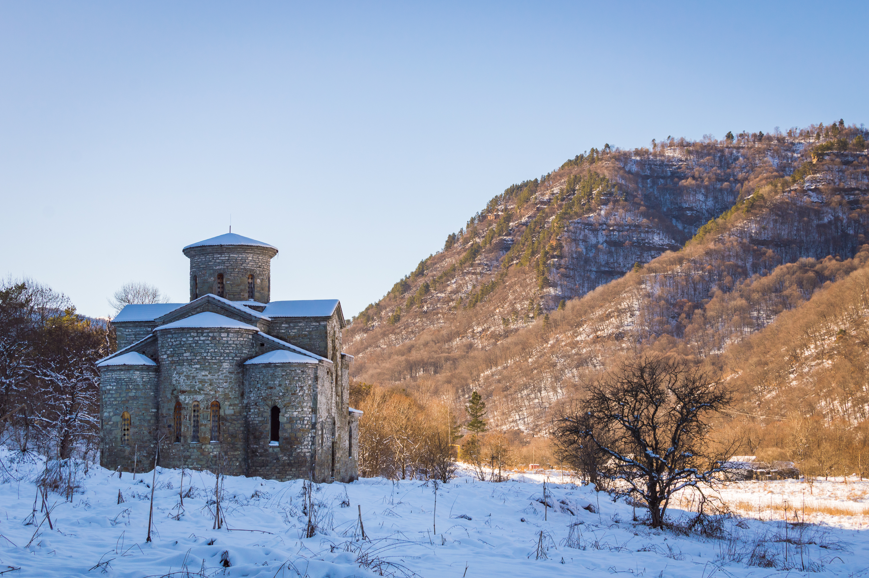 Древний храм в заснеженном Нижнем Архызе
