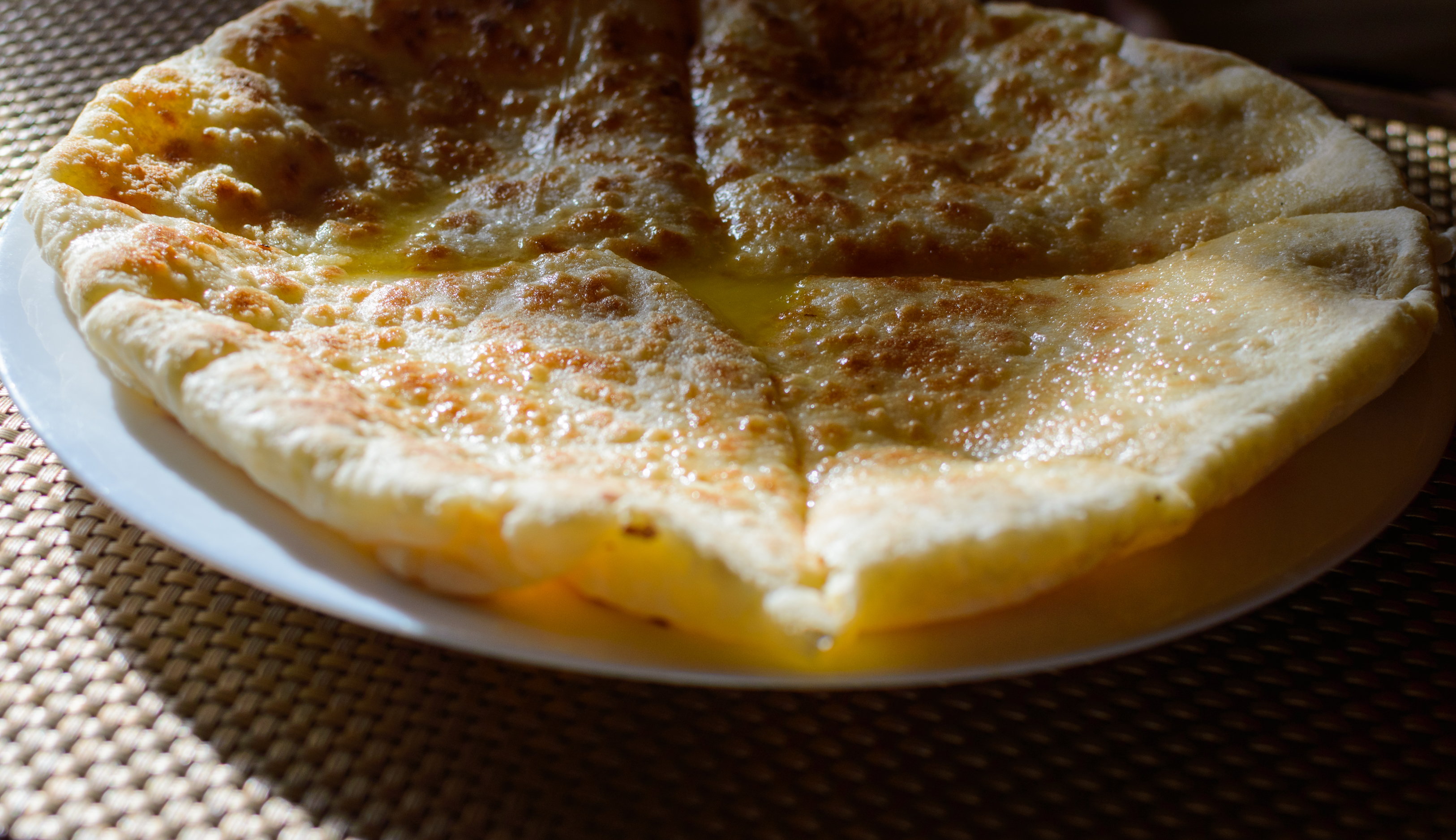 The photograph features an appetizing Georgian khachapuri with butter, a beloved dish of Caucasian cuisine. The scene unfolds in what appears to be a home setting or perhaps a cozy caf – this can be inferred from the simple and natural lighting. The khachapuri sits on a white ceramic plate that contrasts beautifully with the rich color of the dough and the bright golden butter, creating a visually appealing effect. It's cut into portioned slices, making it convenient to eat and emphasizing Georgian hospitality and generosity.