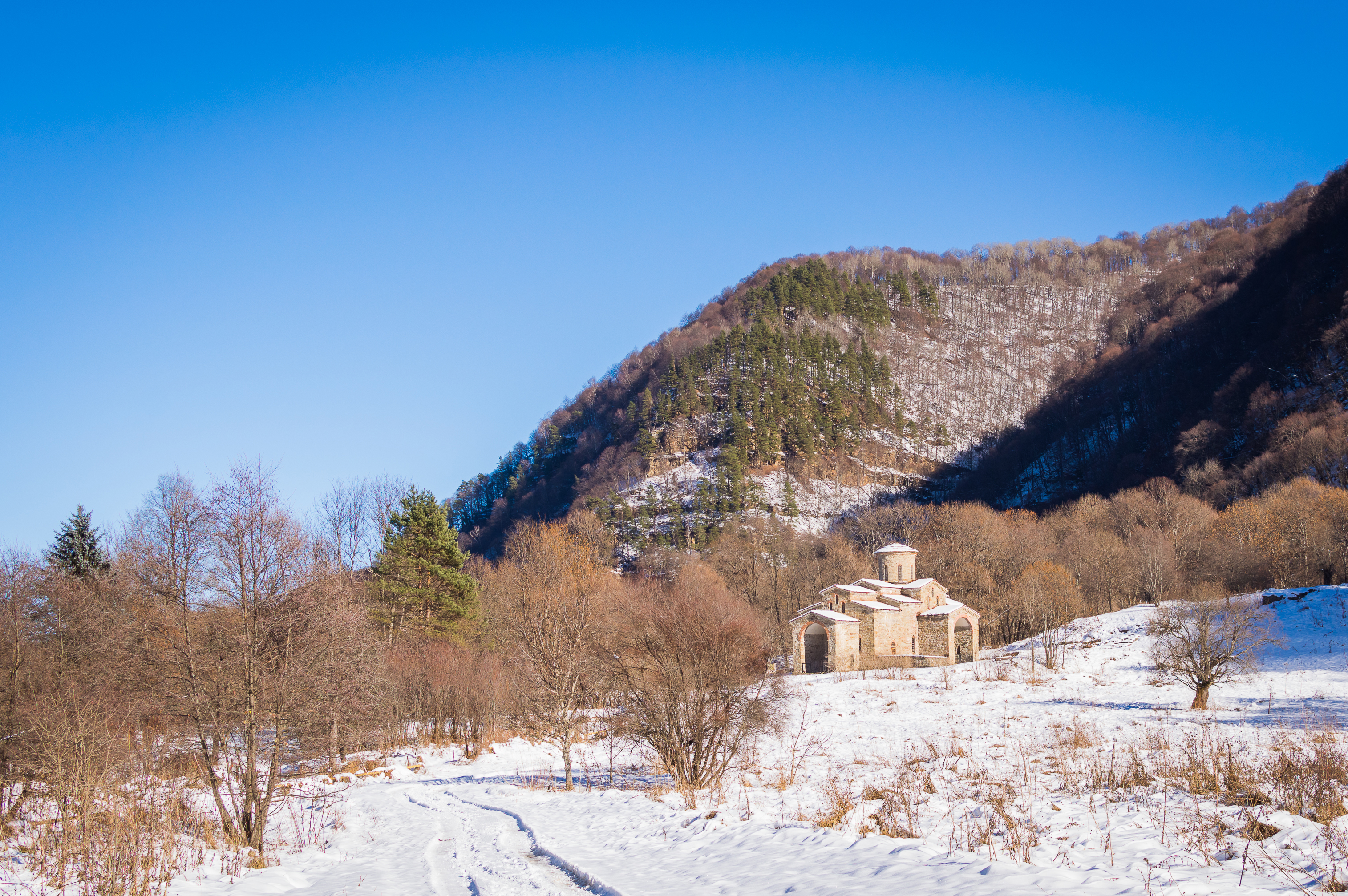 Атмосфера снимка – это сочетание природной красоты, исторического наследия и тишины. Заброшенный храм посреди заснеженной долины, окруженный величественными горами, создает образ места, где время остановилось, а душа находит покой в созерцании вечного.