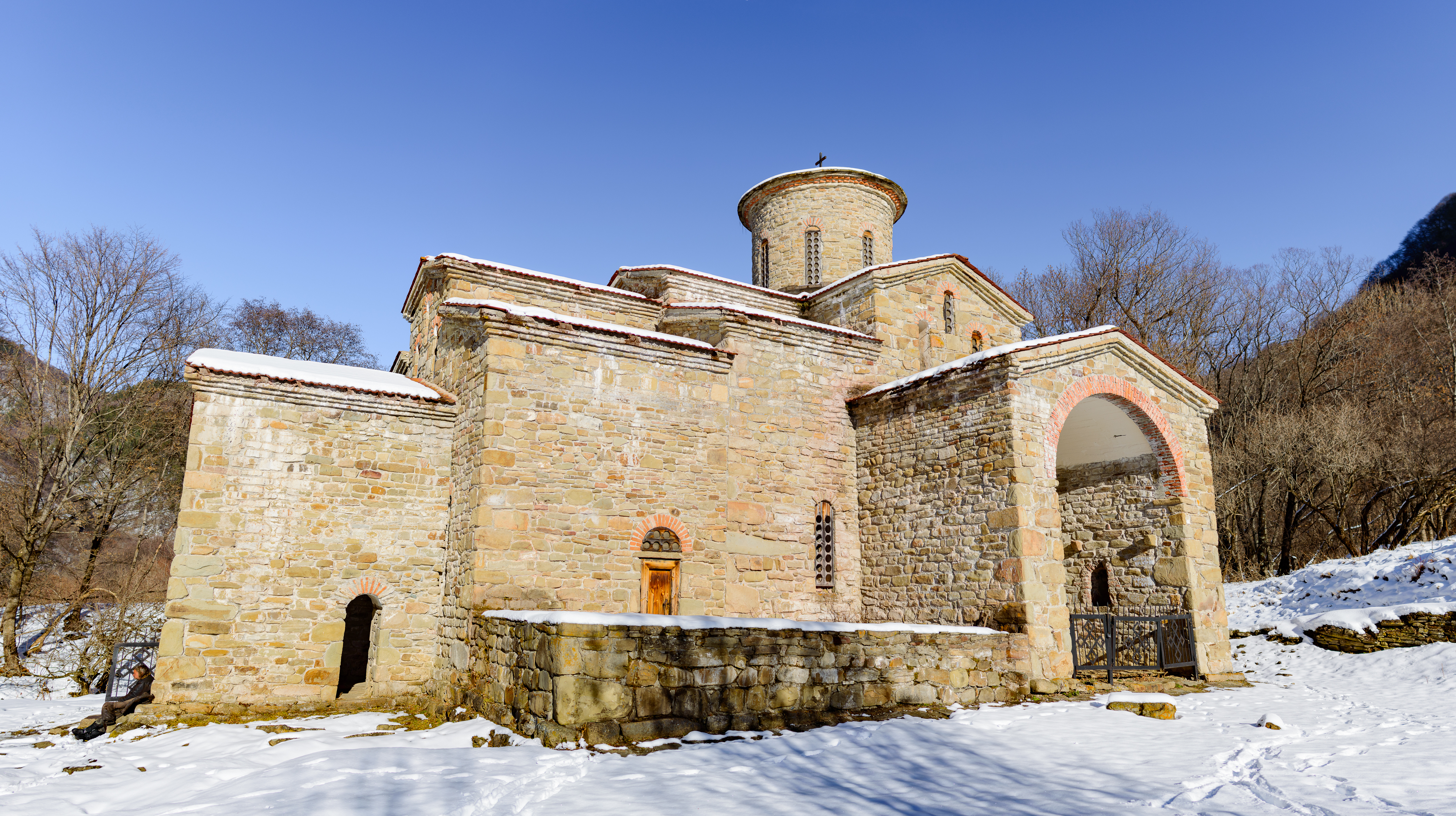 Композиция кадра выстроена таким образом, чтобы максимально передать атмосферу уединения и заброшенности. Храм, построенный из массивных каменных блоков, кажется несокрушимым, несмотря на время и отсутствие прихожан. Его архитектура, с характерным куполом и арочными проемами, напоминает о былом величии и духовной значимости этого места. Окружающий пейзаж, с голыми деревьями и заснеженными склонами гор, усиливает ощущение отрешенности от суеты мира. Цветовая палитра снимка сдержанна: преобладают холодные оттенки синего неба, белого снега и натурального камня, дополненные теплыми, но тусклыми тонами деревянных дверей и черепичной крыши. Освещение равномерное, естественное, подчеркивающее фактуру камня и чистоту зимнего воздуха. Настроение снимка — это смесь восхищения древней архитектурой, легкой грусти по ушедшим временам и глубокого умиротворения, которое дарит природа.