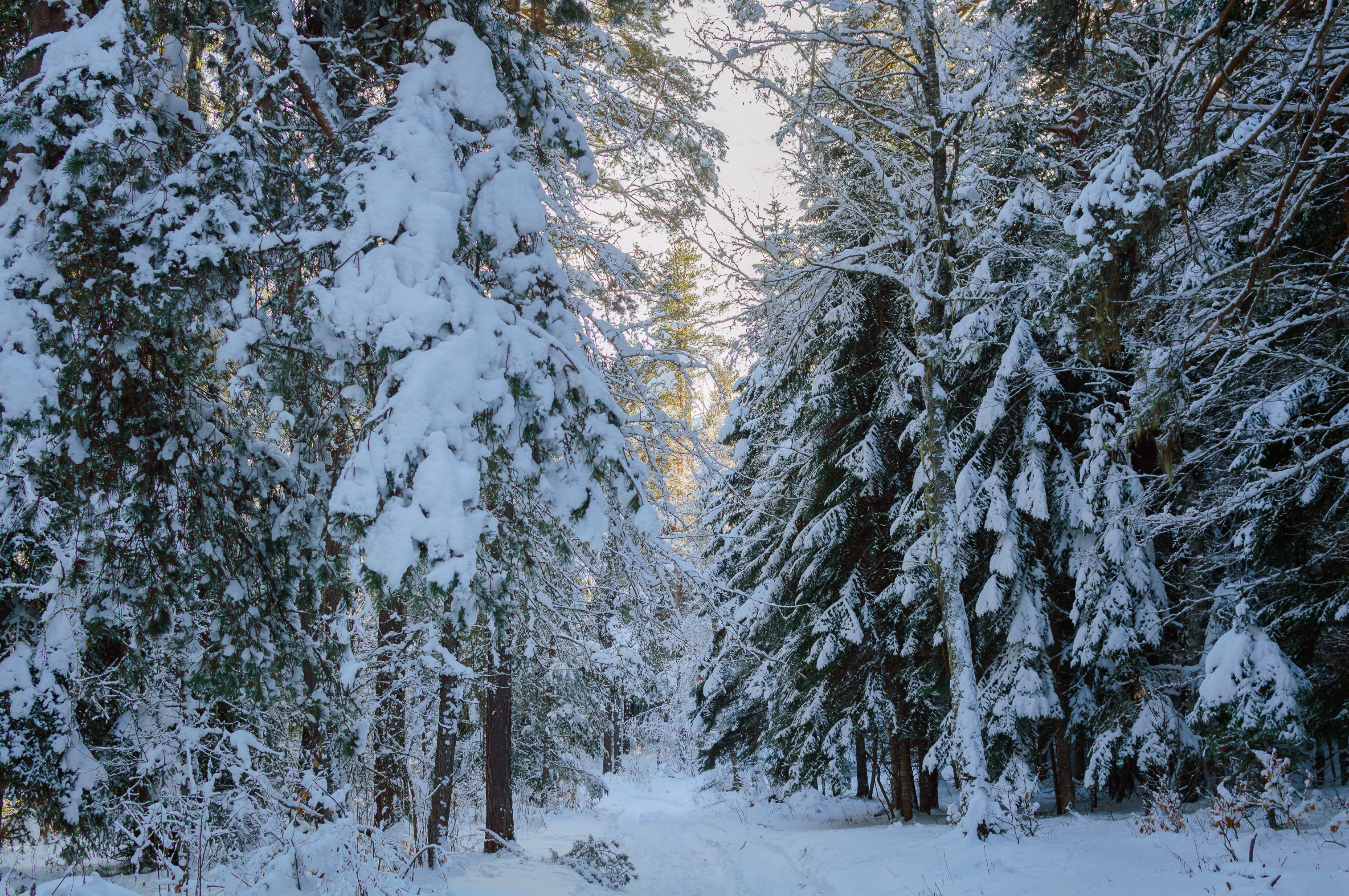 Этот снимок переносит зрителя в самое сердце зимнего леса, где природа демонстрирует свое великолепие в объятиях снега. Густые ели и сосны, укутанные пушистыми снежными шапками, создают ощущение сказочной тишины и умиротворения. Солнечный свет, пробиваясь сквозь ветви, освещает тропу, ведущую вглубь леса, придавая сцене особую глубину и объем.