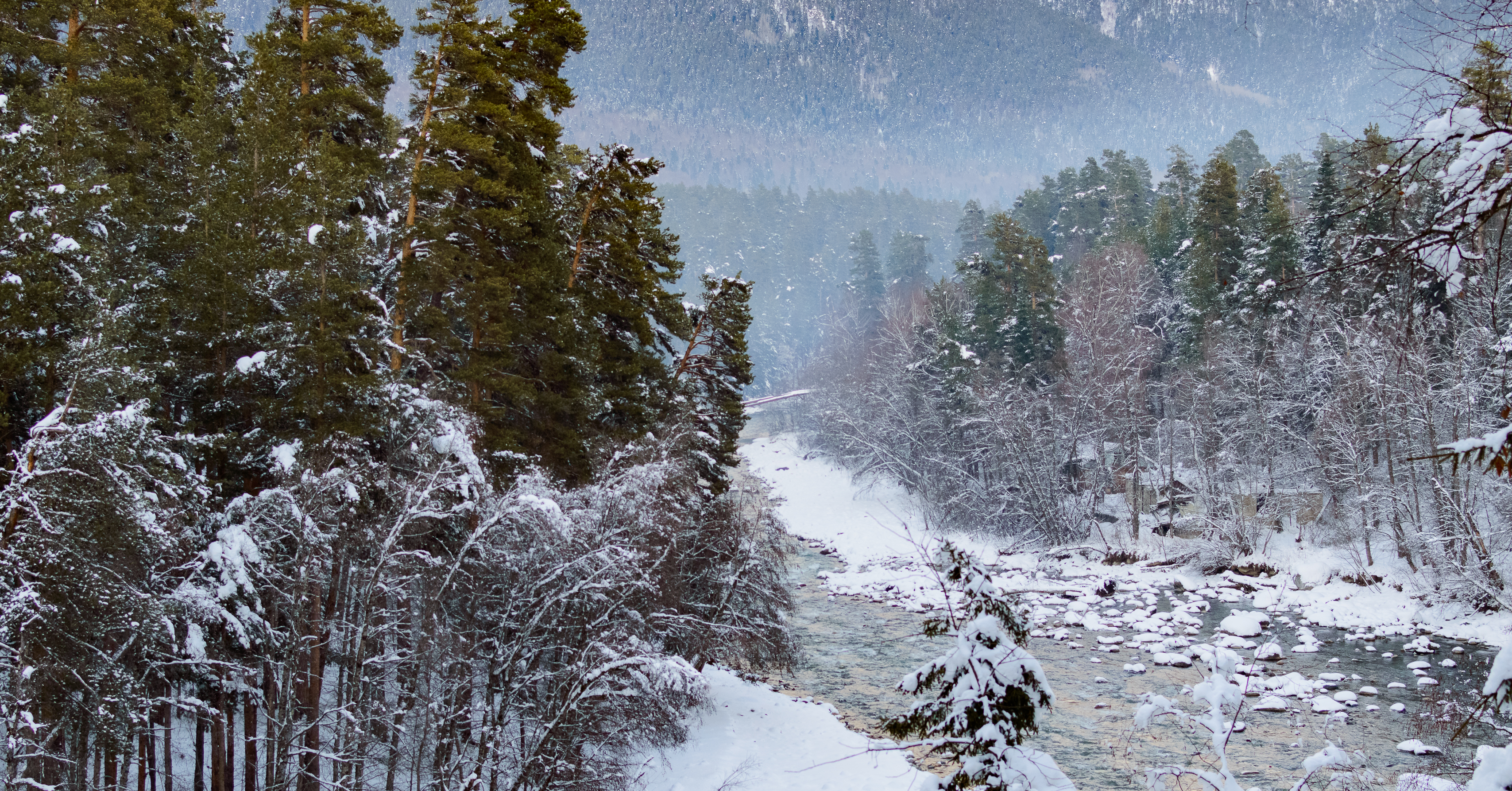 The composition of the shot is arranged so that the viewer's gaze naturally follows the river, delving into the forest thicket and getting lost in the misty mountain distance. The detail of the snow cover on the branches of trees and rocks is impressive, conveying the feeling of a frosty morning and fresh air. This landscape will be an excellent addition to any collection dedicated to the beauty of Russian winter and mountain landscapes.