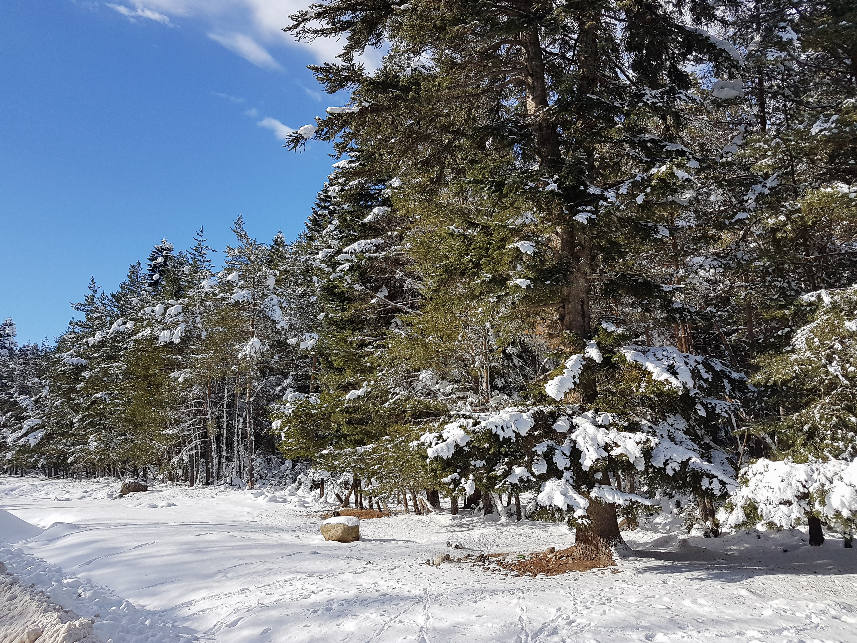 Snowy winter mountains with softwood forest