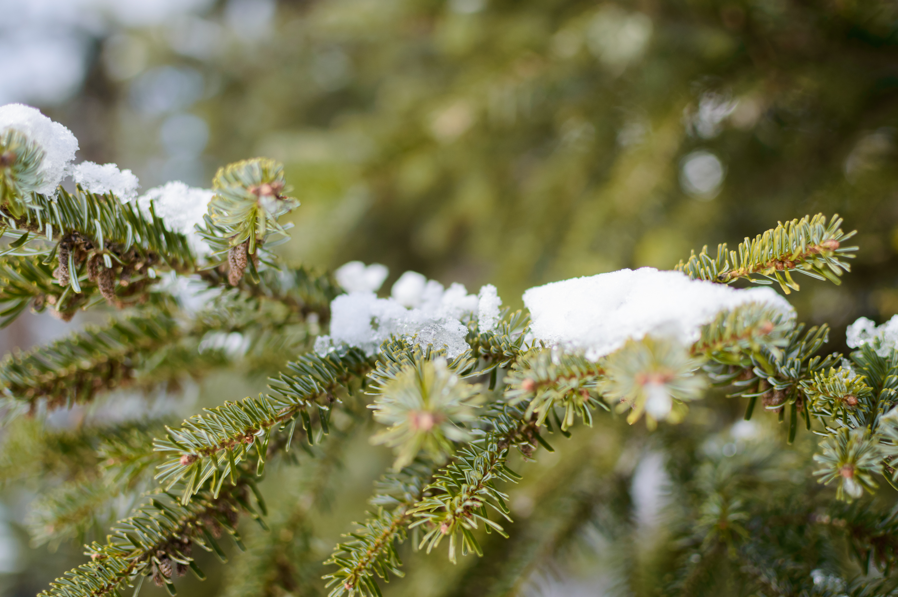 This image invites the viewer into a world of winter silence and natural harmony. A macro shot of a spruce branch, sprinkled with fresh, sparkling snow, showcases the amazing detail and texture of the pine needles, contrasting with the pristine white covering. The soft focus creates a sense of depth, allowing concentration on the delicate beauty of the snowy nature. The green needles, covered with white flakes, look like precious stones illuminated by soft winter light. The air is filled with a sense of coolness and purity, typical of a frosty morning in the forest. This photo is ideal for conveying the atmosphere of winter holidays, coziness, and tranquility, and can also be used as a background for thematic projects related to nature, seasons, or festive decor. The image conveys a feeling of peace and admiration for the grandeur of nature, capturing a fleeting moment of winter magic. The detail of the snowflakes and the texture of the branch's bark create a sense of presence, immersing the viewer in the atmosphere of a snowy forest. The color palette, consisting of muted green and pure white shades, emphasizes the natural beauty of the scene and creates a calming effect. This shot is a hymn to winter beauty, captured with a love for detail.