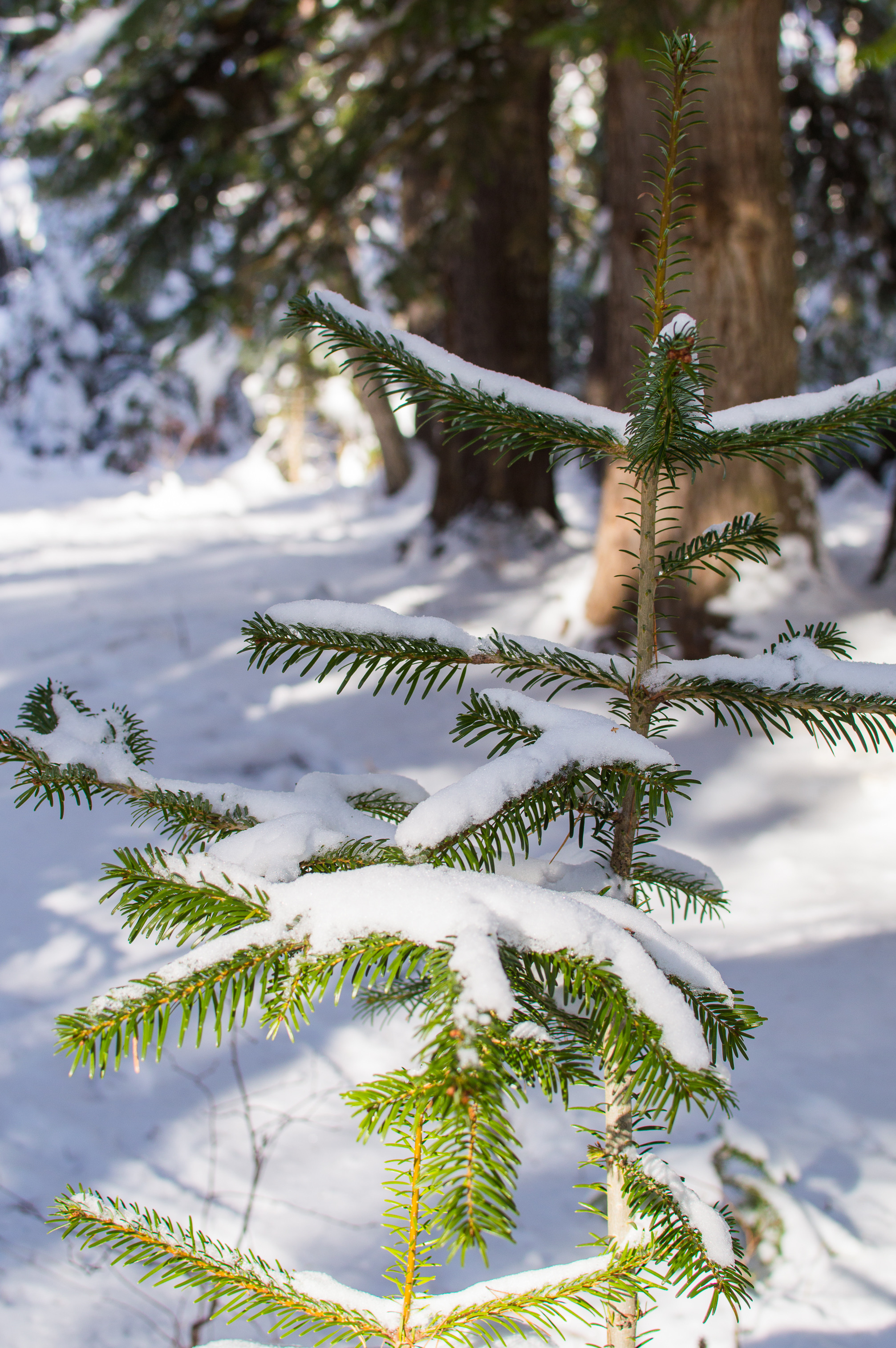 This shot transports us to the quiet heart of a winter forest, where nature is wrapped in a snowy blanket. At the center of the composition is a young fir tree, whose green needles strikingly contrast with the fluffy snow settled on its branches. Each clump of snow accentuates the delicate texture of the needles, creating a sense of freshness and purity.