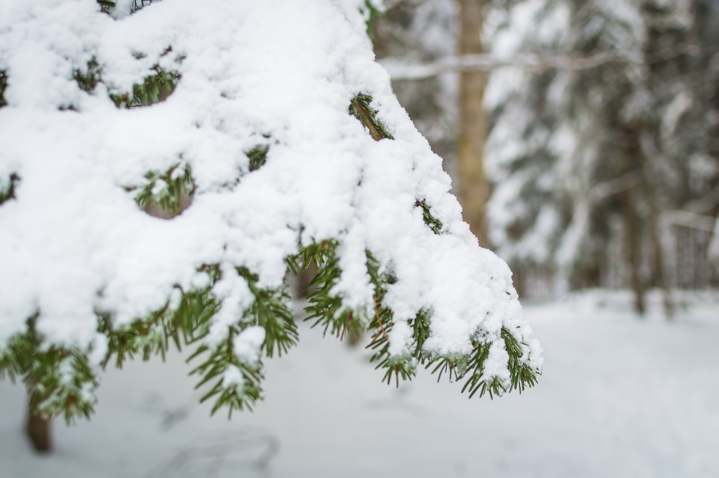 This image immerses the viewer in the atmosphere of a serene winter fairy tale. The foreground features a close-up of a fir branch generously covered with fluffy white snow. The spruce needles are a vibrant green, contrasting with the pristine white covering, creating a picturesque pattern. The snow lies in a thick layer, showcasing its softness and volume, as if an artist had carefully sprinkled it over each twig.