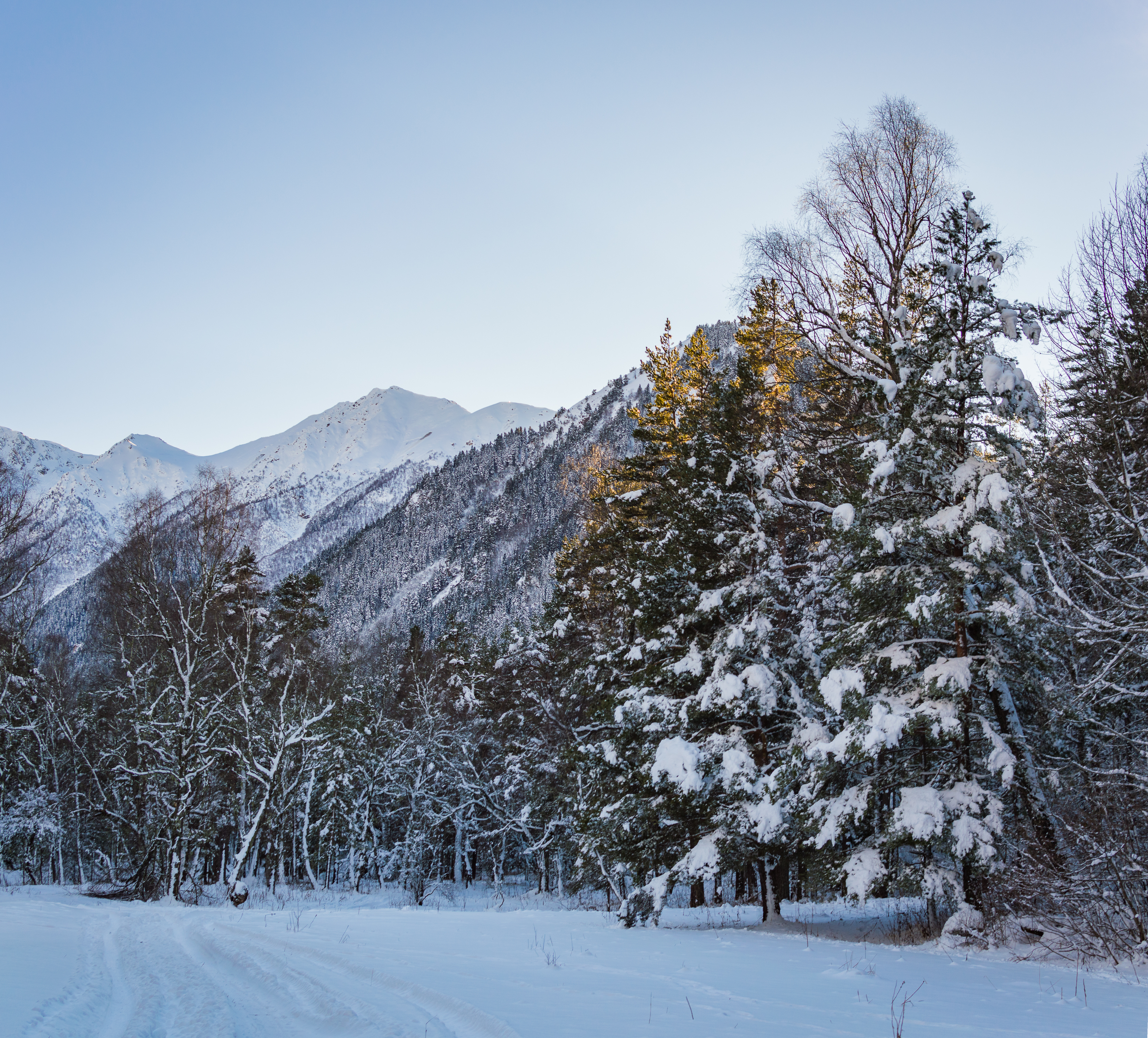 To the left of the trees stretches a snow-covered road, leading deeper into the forest. Tracks in the snow suggest that people or vehicles have recently passed through, adding a sense of presence and mystery to the image. The road curves, inviting the viewer to embark on a journey through this magical winter world.