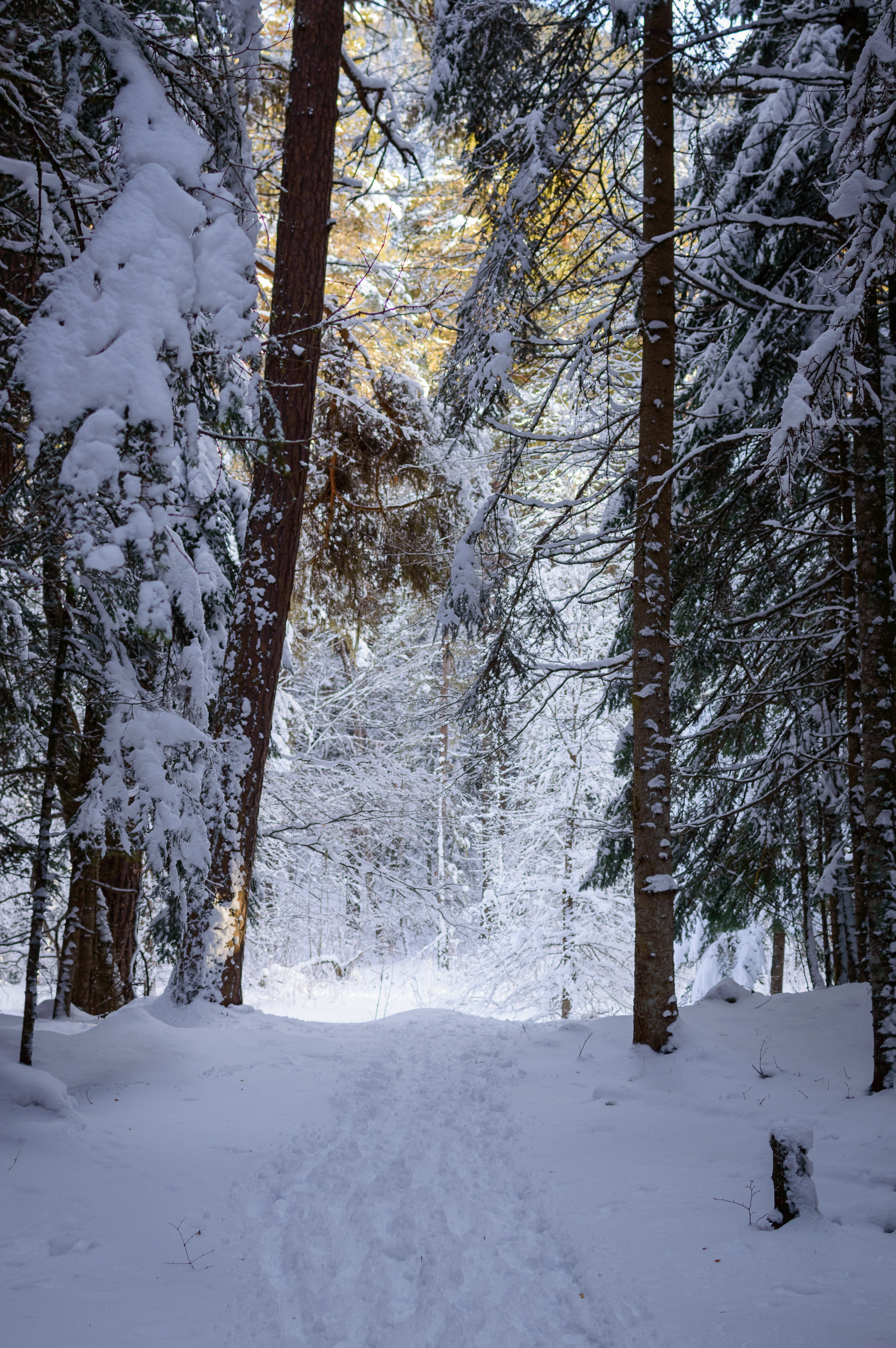 Тропа, утоптанная в глубоком снегу, извивается, приглашая пройти вперед, вглубь этого белоснежного мира. Солнечный свет, пробиваясь сквозь густые кроны, освещает тропинку, создавая игру света и тени и подчеркивая объем снежного покрова. Теплые золотистые лучи контрастируют с холодными оттенками снега и темной корой деревьев, добавляя изображению глубины и живописности.