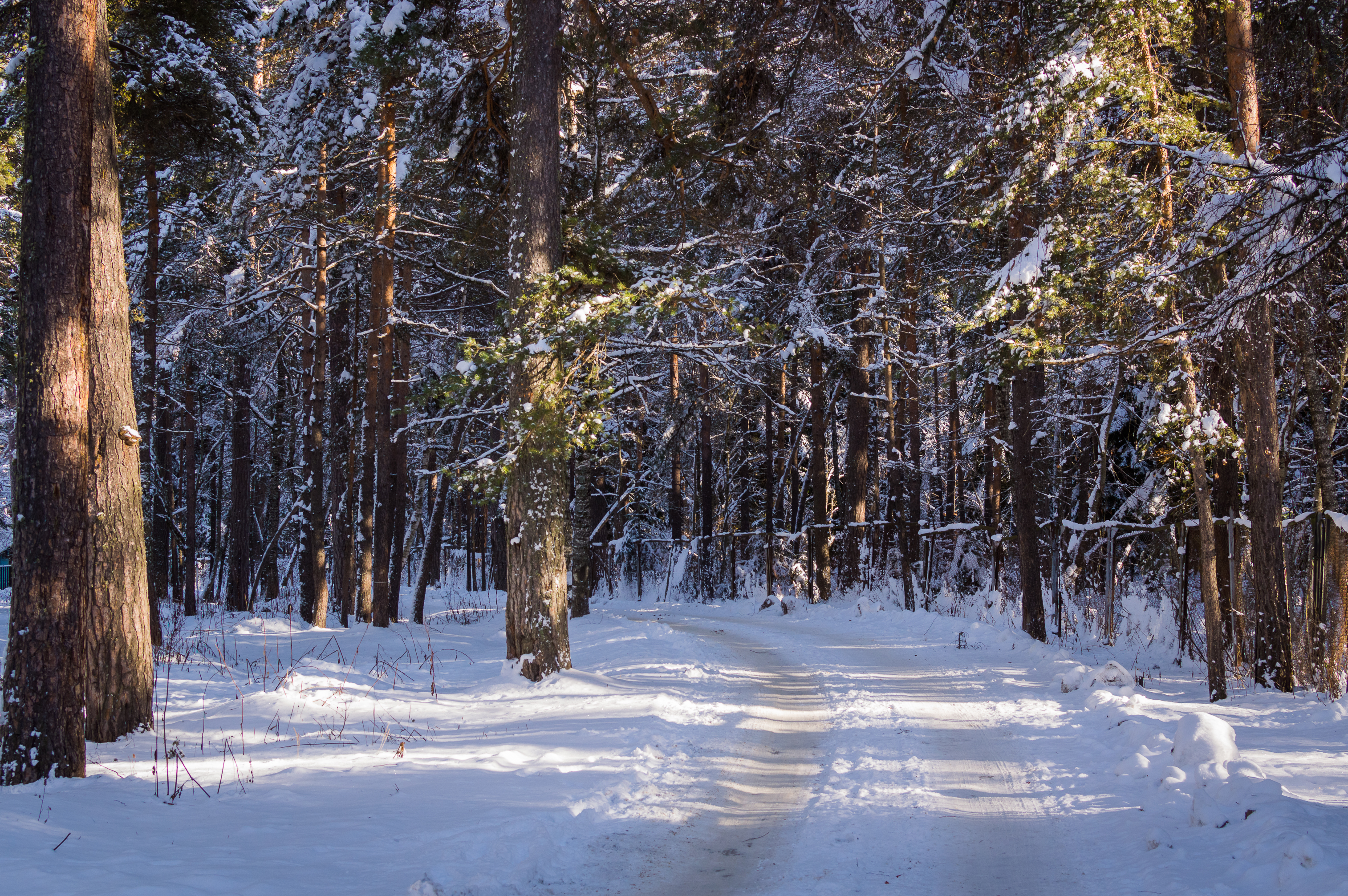 Winter forest: sunny day on the forest road