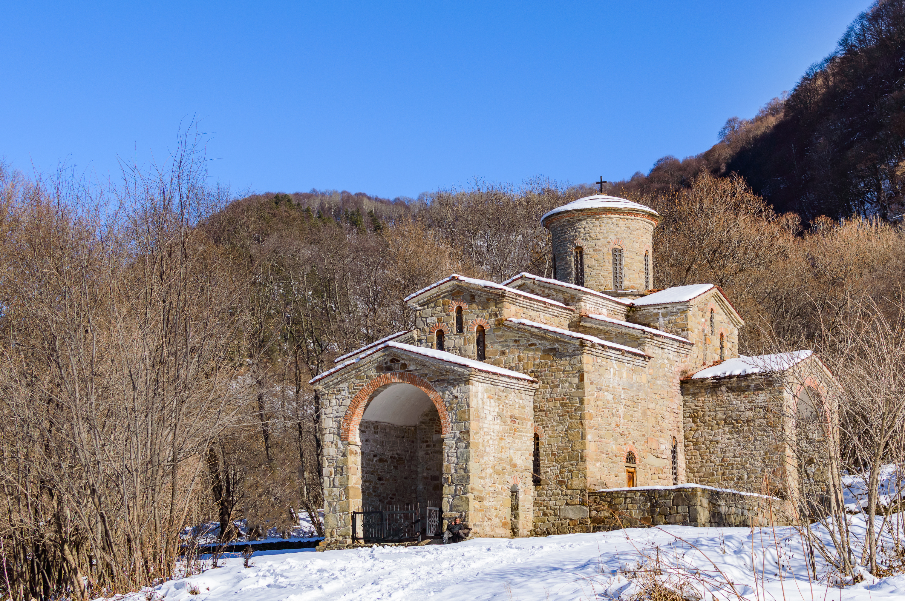 The temple, built from massive stone blocks, possesses a special allure. Its dome, crowned with a cross, proudly rises above the surrounding landscape. The arch of the main entrance, also covered in snow, invites the viewer to immerse themselves in the history of this place. A dense forest with bare trees stretches around the temple, their frost-covered branches adding graphic quality and rugged beauty to the landscape.