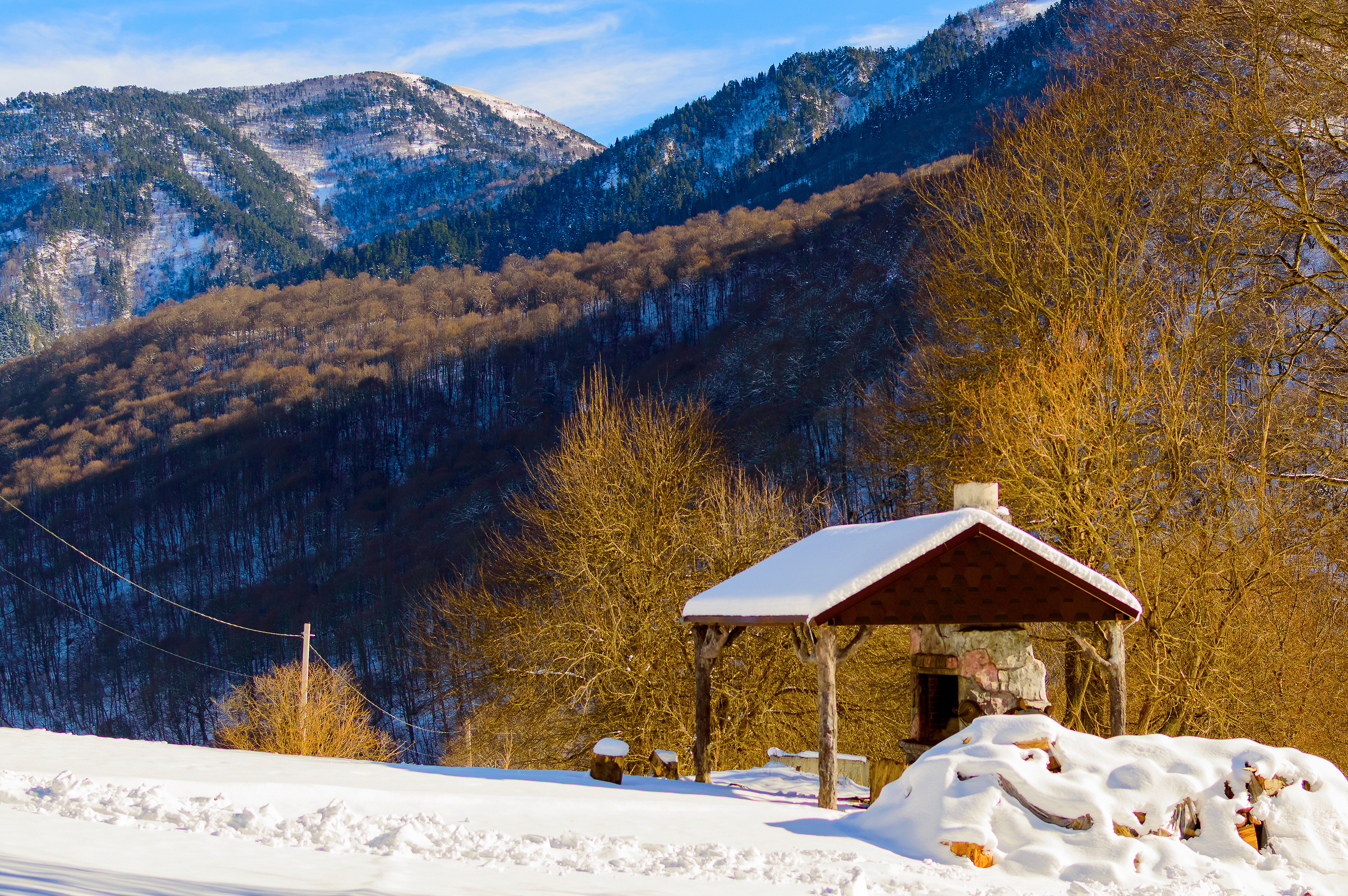 Композиция изображения строго сбалансирована: горы занимают большую часть кадра, а их силуэты формируют естественные диагонали, ведущие взгляд зрителя вглубь сцены. Свет падает преимущественно слева, подчеркивая рельеф скал и создавая глубокие тени, которые усиливают объемность и трехмерность изображения. Текстура снега — мелкозернистая, почти шелковистая, особенно на переднем плане, где он выглядит свежим и не тронутым. Скалы, в свою очередь, имеют грубую, пористую поверхность, местами покрытую мхом или ледяной коркой, что добавляет сложности и фактуры. Цветовая палитра состоит из холодных оттенков — белого, серого, синевато-голубого — с акцентами теплого золота и оранжевого от солнца, что создает контраст между холодом зимы и теплом света. Освещение мягкое, рассеянное, но достаточно яркое, чтобы подчеркнуть все детали без резких переходов.
