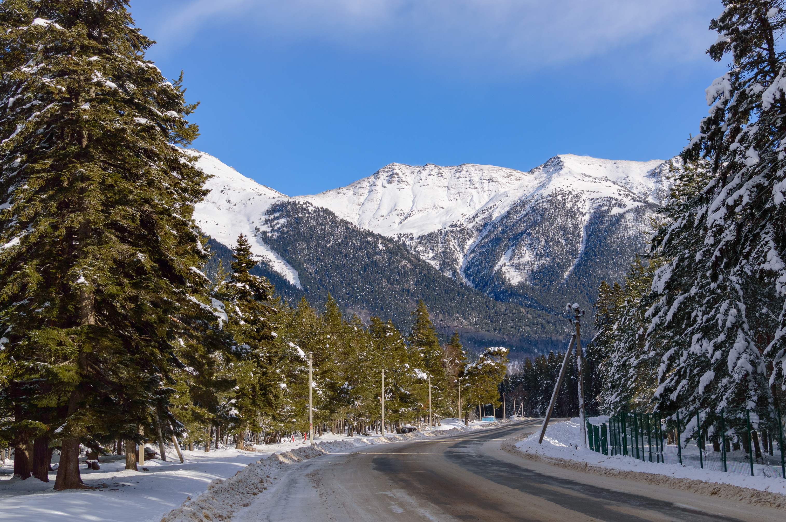 С обеих сторон дороги раскинулся густой хвойный лес, деревья которого щедро укрыты белоснежными шапками. Их темно-зеленая хвоя контрастирует с ослепительной белизной снега, создавая живописную игру красок. Солнечные лучи пробиваются сквозь ветви, освещая отдельные участки дороги и подчеркивая объем и текстуру снежного покрова.