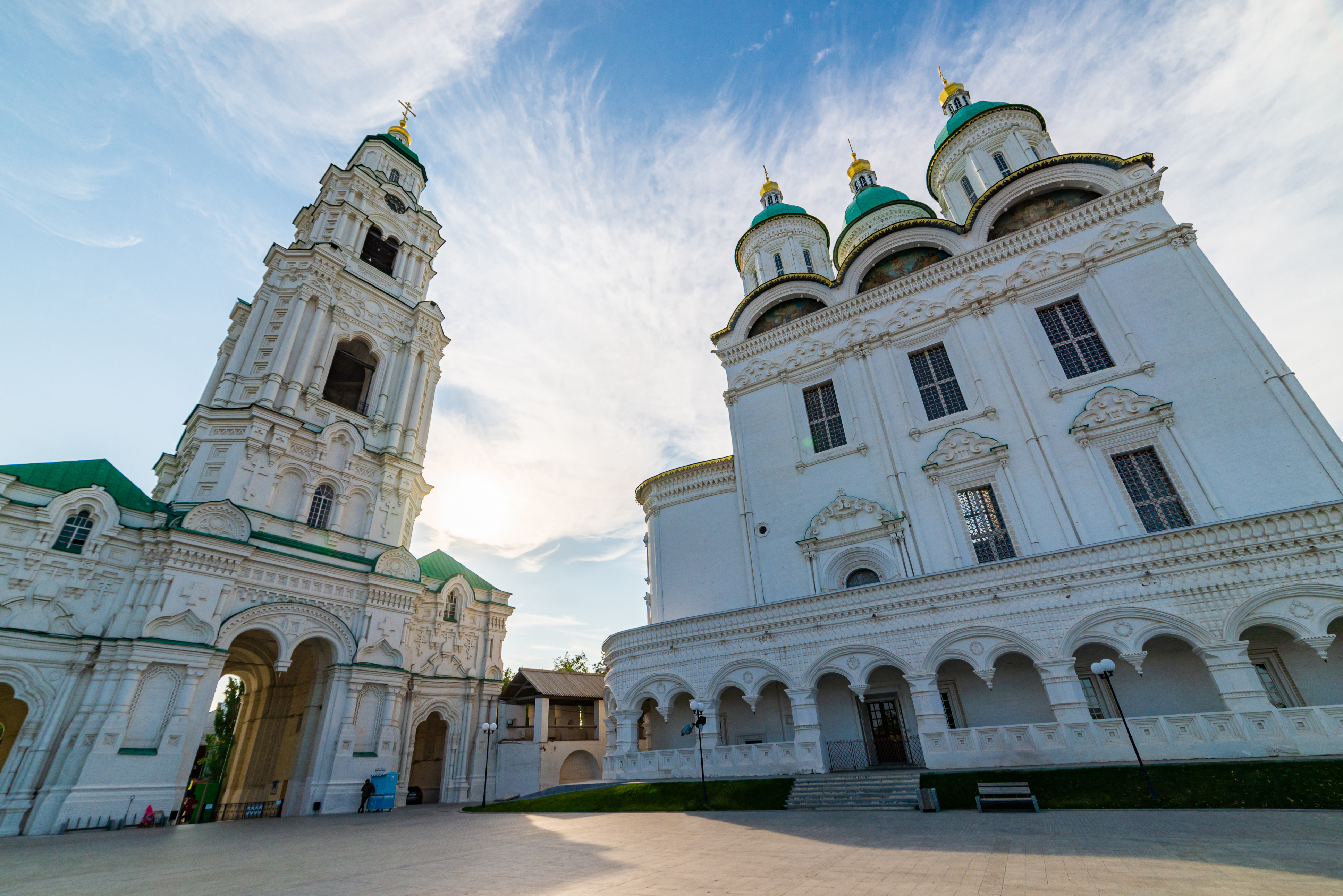 Этот захватывающий вид открывает величественный архитектурный ансамбль Астраханского кремля, где доминируют Успенский собор и его высокая колокольня. Снятое с низкой точки, изображение создает ощущение монументальности и величия, подчеркивая масштабы зданий. Голубое небо с легкими перистыми облаками, освещенное ярким солнечным светом, добавляет контраста и объема, делая архитектурные детали еще более выразительными. Зеленые купола собора и крыши зданий выделяются на фоне белых стен, создавая классическую и гармоничную палитру. Широкоугольный объектив искажает перспективу, делая башни еще более высокими и устремленными ввысь, что придает снимку динамичность и драматичность. Площадь перед собором вымощена камнем, создавая ровную поверхность, на которой играют солнечные блики и тени, добавляя глубину изображению. Это фото идеально передает атмосферу исторического места, приглашая зрителя к погружению в прошлое и восхищению мастерством зодчих.