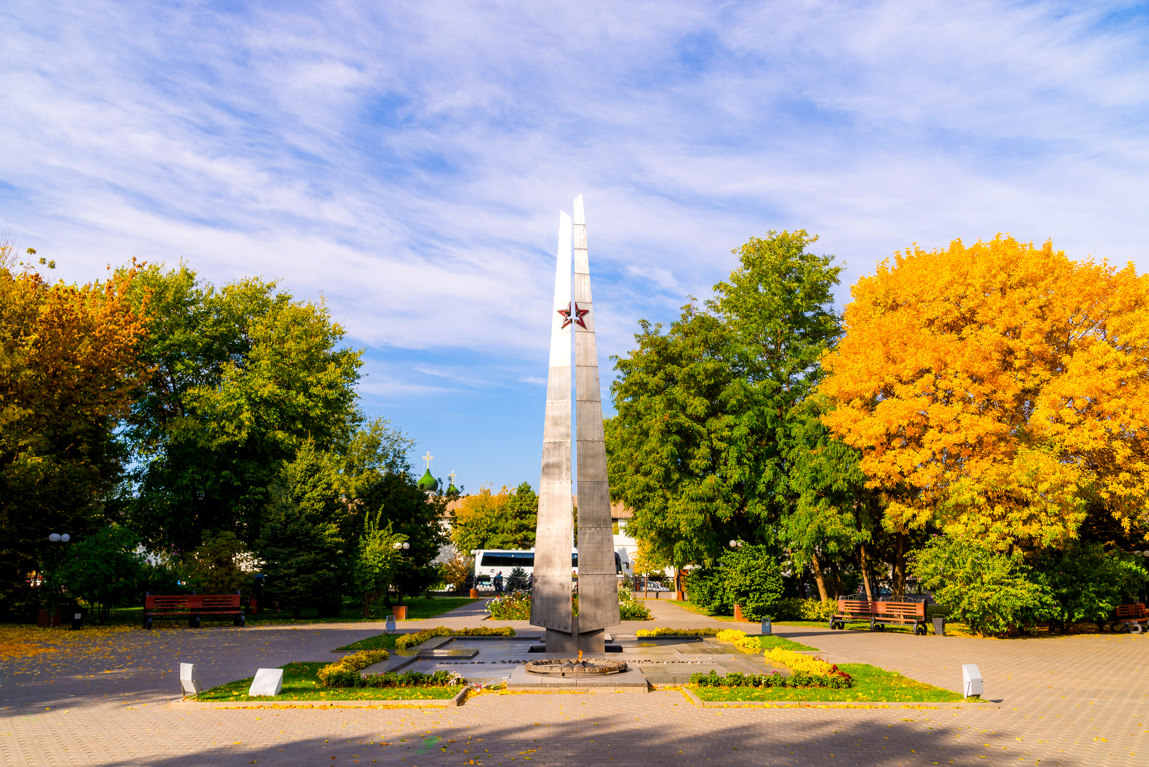 Перед зрителем предстает величественный обелиск, возведенный в память о героях Великой Отечественной войны. Монумент расположен в живописном Братском парке города Астрахань, где царит атмосфера тишины и уважения к памяти павших. Дата съемки – 6 октября 2019 года – добавляет снимку документальности и подчеркивает важность сохранения исторической памяти. Обелиск словно вырастает из земли, возвышаясь над окружающим ландшафтом, символизируя стойкость духа и непоколебимость в борьбе за мир и свободу. Парк, укрытый осенней листвой, создает спокойный фон, позволяя зрителю сосредоточиться на монументе как на центральном объекте изображения. Ощущается легкая меланхолия и благоговение перед подвигом предков, что делает это место особенным и значимым для каждого жителя России.