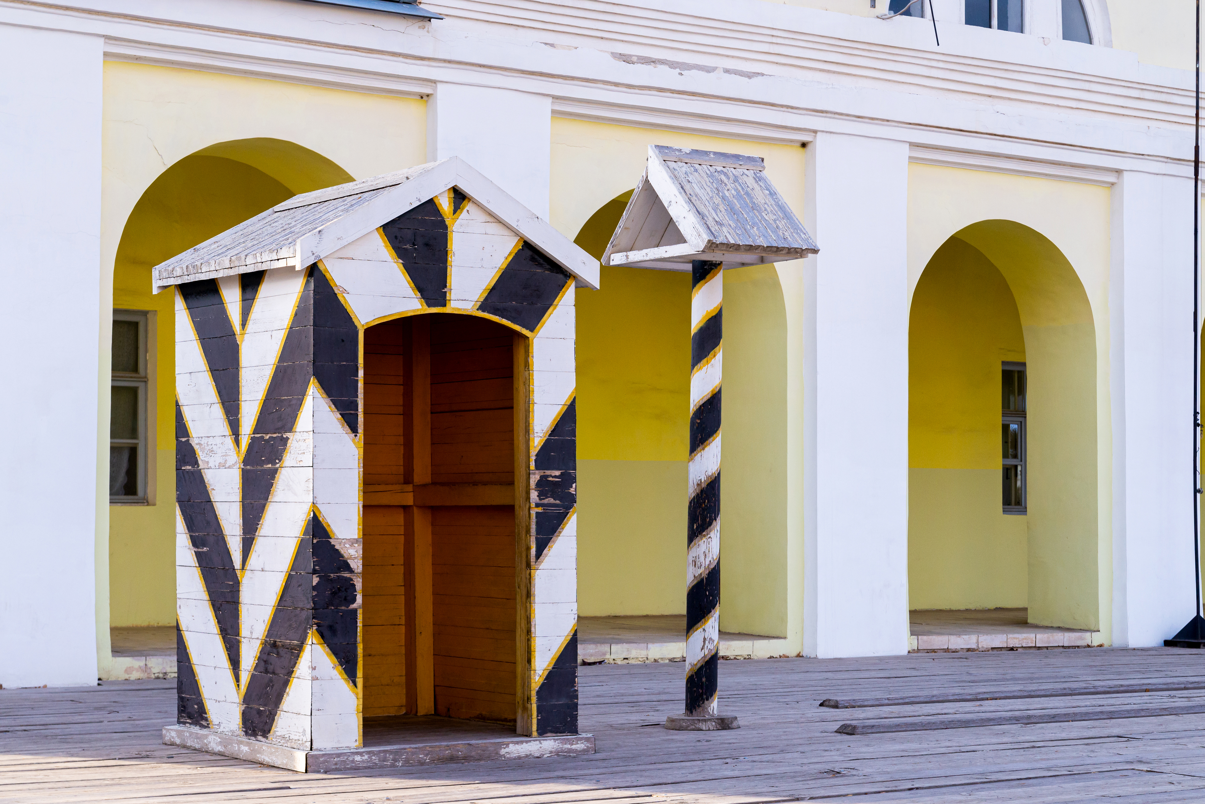 Атмосфера изображения наполнена ощущением одиночества и покоя, словно здесь уже ничего не происходит. Освещение естественное, пришедшее с заката, что делает каждый элемент будки более четко видимым. Текстура стен и крыши будки создают ощущение глубины кадра, а полосатая ткань на окнах придает изображению динамичность и контраст.