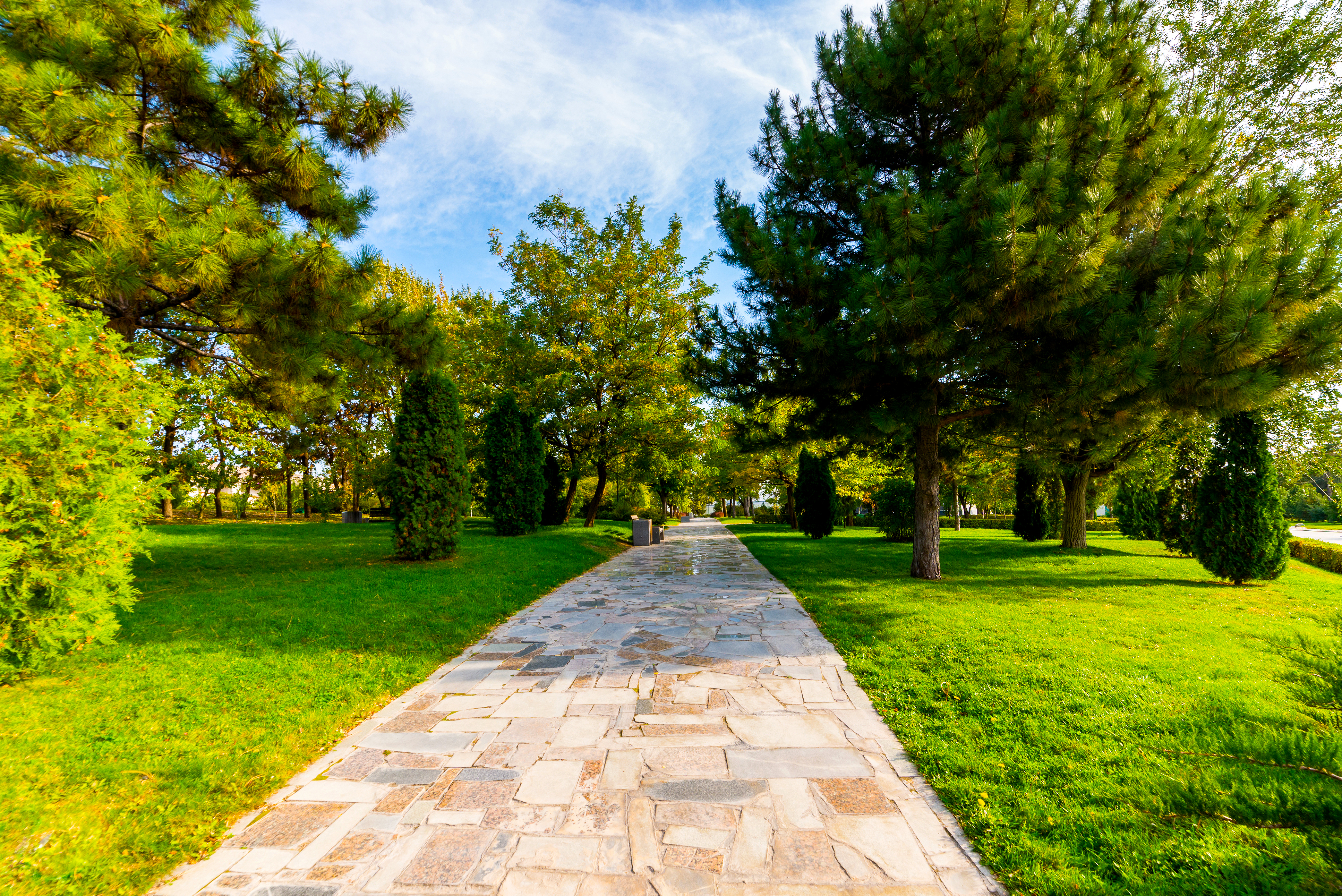 The photograph depicts a picturesque alleyway winding through a well-maintained park on a sunny summer day. The stone pavement, laid with various rock types, creates a unique pattern and texture underfoot. On either side of the alley are lush green lawns adorned with neatly trimmed shrubs and tall pine trees, creating a cool shade.