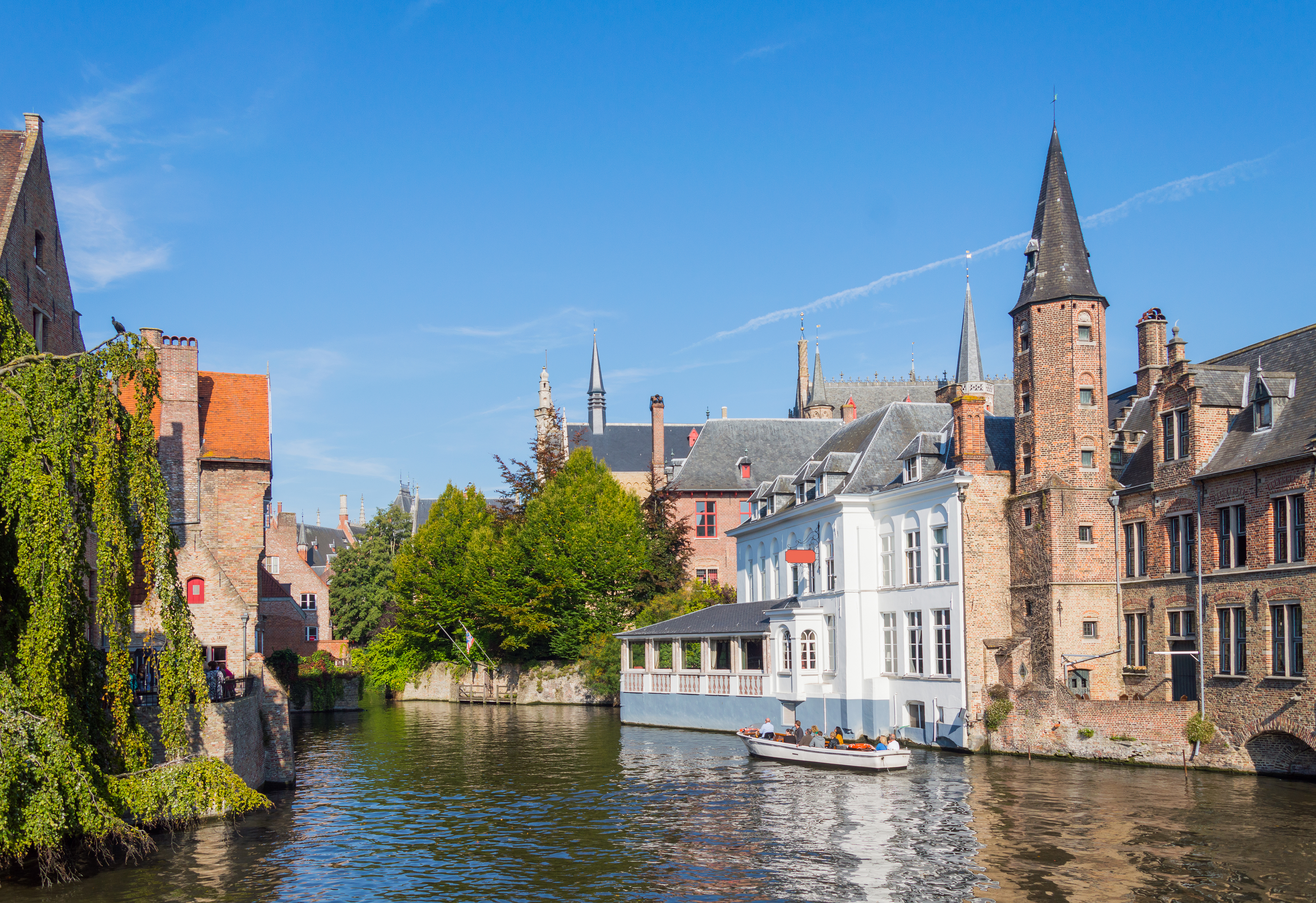 This captivating image captures the serene beauty of a canal in Bruges, Belgium, surrounded by centuries-old architecture that speaks to the city's rich history. The scene unfolds under a vibrant blue sky with just a few wispy clouds, enhancing the clarity and brightness of this urban landscape. On both sides of the waterway, historic buildings with distinctive red roofs, white facades, and weathered brick walls rise gracefully, their reflections dancing on the calm surface below. A small tourist boat navigates through the canal, carrying visitors who enjoy the tranquil ambiance and picturesque views.