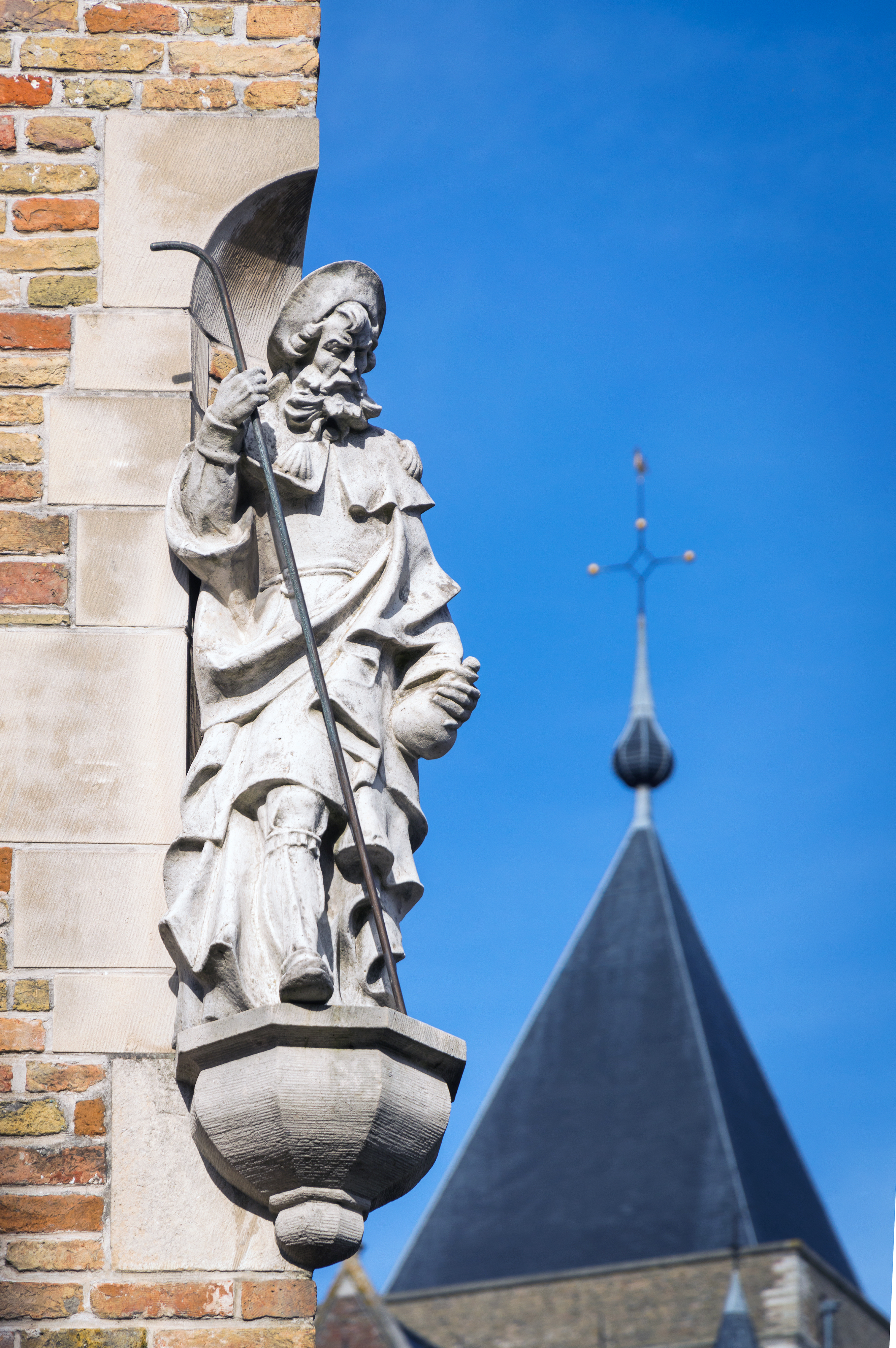 This captivating image captures a weathered stone sculpture of Saint Men, prominently positioned on the corner of an old brick building. The composition places the statue in sharp focus against a vibrant blue sky, creating a striking contrast that highlights its intricate details and historical character. In the background, the silhouette of a church spire with a cross atop adds depth and context, suggesting this is part of a historic European town or village where faith and architecture intertwine. The bright daylight enhances the textures of both the stone statue and the brickwork, revealing layers of age and craftsmanship.