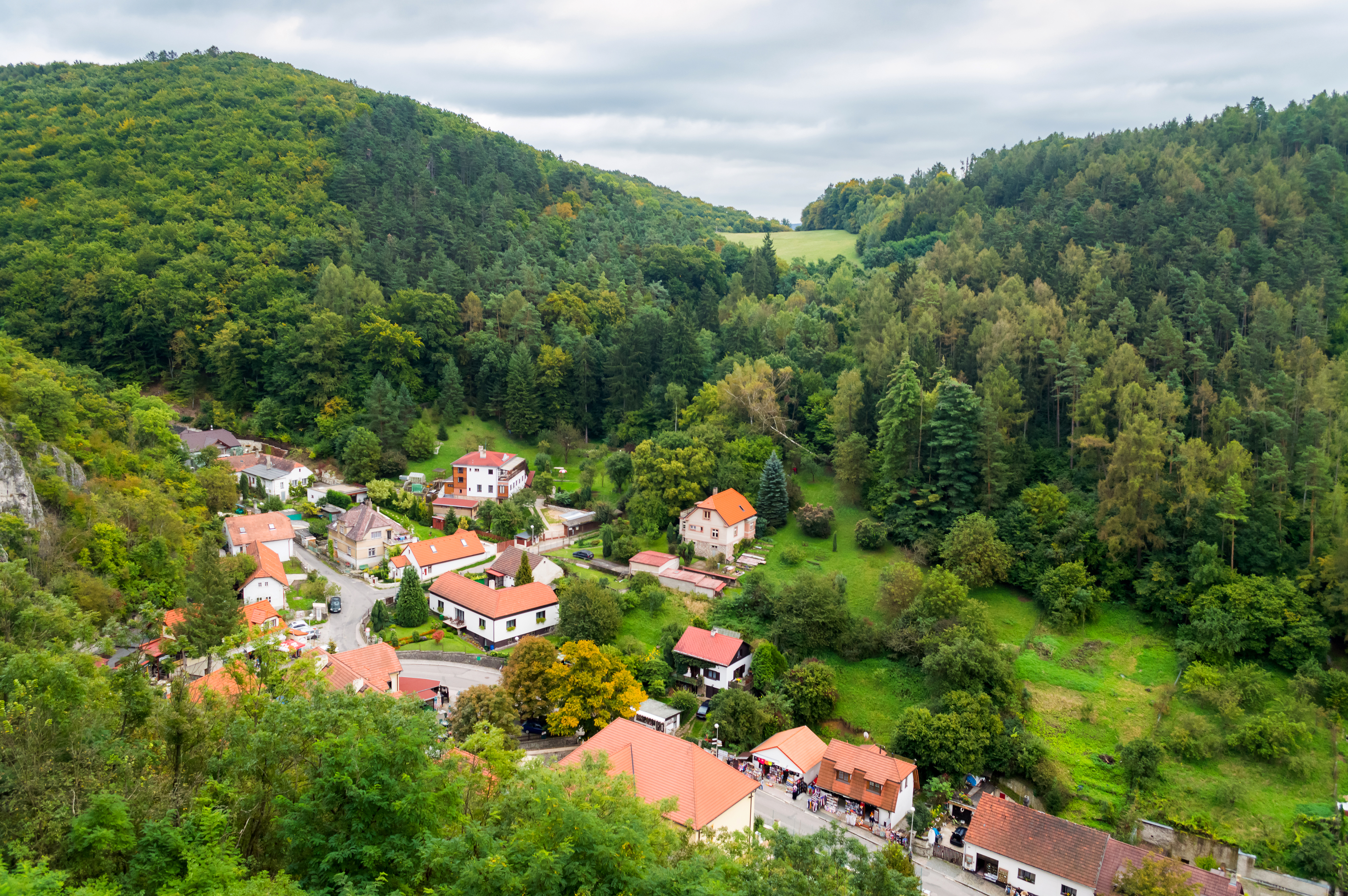 Этот захватывающий аэрофотоснимок показывает Карлштейн — очаровательную деревню в Чехии, укрытую между густыми лесами и холмистой местностью. Поселение раскинулось по извилистой дороге, его красные черепичные крыши выделяются на фоне живописной растительности — густых деревьев и лугов. Облачное небо создает мягкое рассеянное освещение, подчеркивая богатство текстур листвы и камня без резких теней. Композиция сбалансирована: деревня расположена в долине, окруженная лесными склонами, которые круто поднимаются по обеим сторонам, создавая драматический природный каркас. На переднем плане группы домов с терракотовыми крышами переплетаются с яркими осенними деревьями, добавляя глубину и цветовой контраст зелени. Этот образ вызывает ощущение спокойствия и вечной красоты, сочетая уютную русскую деревню и величественный масштаб ее дикой природы. Высокий ракурс предлагает погружение в перспективу, позволяя зрителям оценить гармоничное сочетание человеческого жилья и не тронутой природы.
