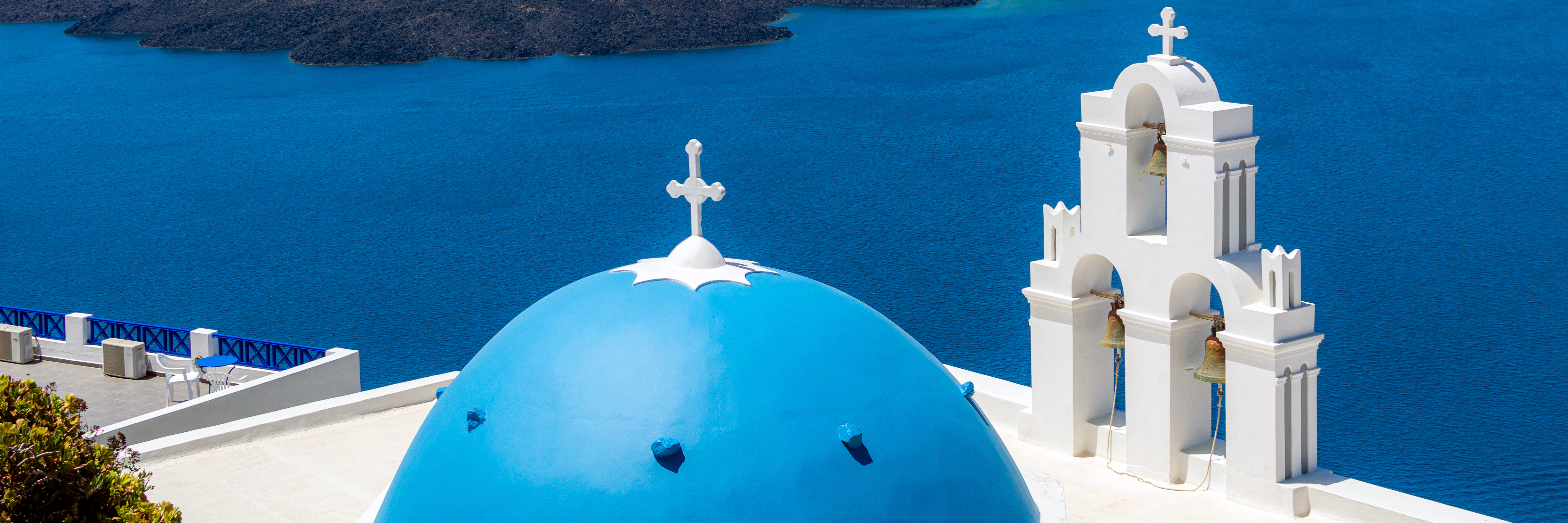Это захватывающее аэрофото изображает иконичную церковь с синим куполом на острове Санторини, Греция, расположенную на скале над глубокими бирюзовыми водами Средиземного моря. Белые стены и колокольня здания выделяются на фоне ярких цветов, воплощая классическую греческую островную эстетику. Фотография была сделана в дневное время при чистом небе, позволяя солнцу полностью осветить все детали — от гладкой текстуры расписанного купола до потертых каменных арок колокольни. На заднем плане темные вулканические скалы и спокойная вода усиливают контраст, а небольшое растительство добавляет естественную глубину. Композиция тщательно сбалансирована, церковь является главным объектом, окруженной обширными морскими видами, что вызывает ощущение спокойствия и вечной красоты. Эта сцена передает умиротворение и духовное спокойствие, приглашая зрителей представить себя на этом идеальном месте отдыха — идеально для путешествий или дизайна проектов, требующих аутентичного средиземноморского шарма. Общая атмосфера спокойная и величественная, сочетает религиозный символизм с природной грандиозностью, создавая впечатление как священного, так и универсально привлекательного.
