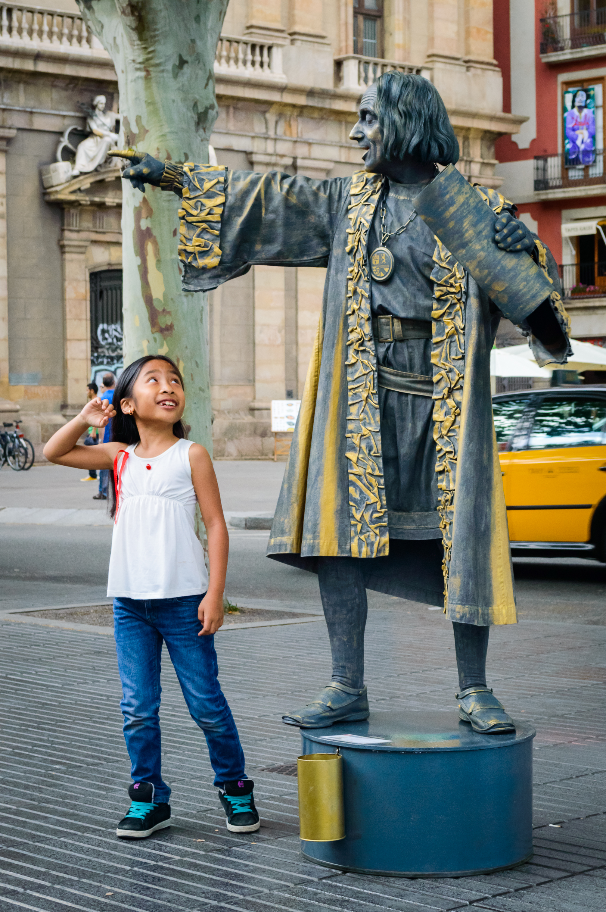 Next to the monumental figure of Columbus stands a little Asian girl, dressed in a simple white t-shirt and blue jeans. Her gaze is directed upwards towards the artist, and her face is filled with wonder and delight. She appears captivated by this animated historical character. Her posture, with a raised hand, seems to reflect her engagement with the spectacle. The sunny day in Barcelona likely creates a warm and lively atmosphere, typical of the summer tourist season. Bright sunlight illuminates the scene, highlighting the contrast between the static statue and the lively, curious girl.
