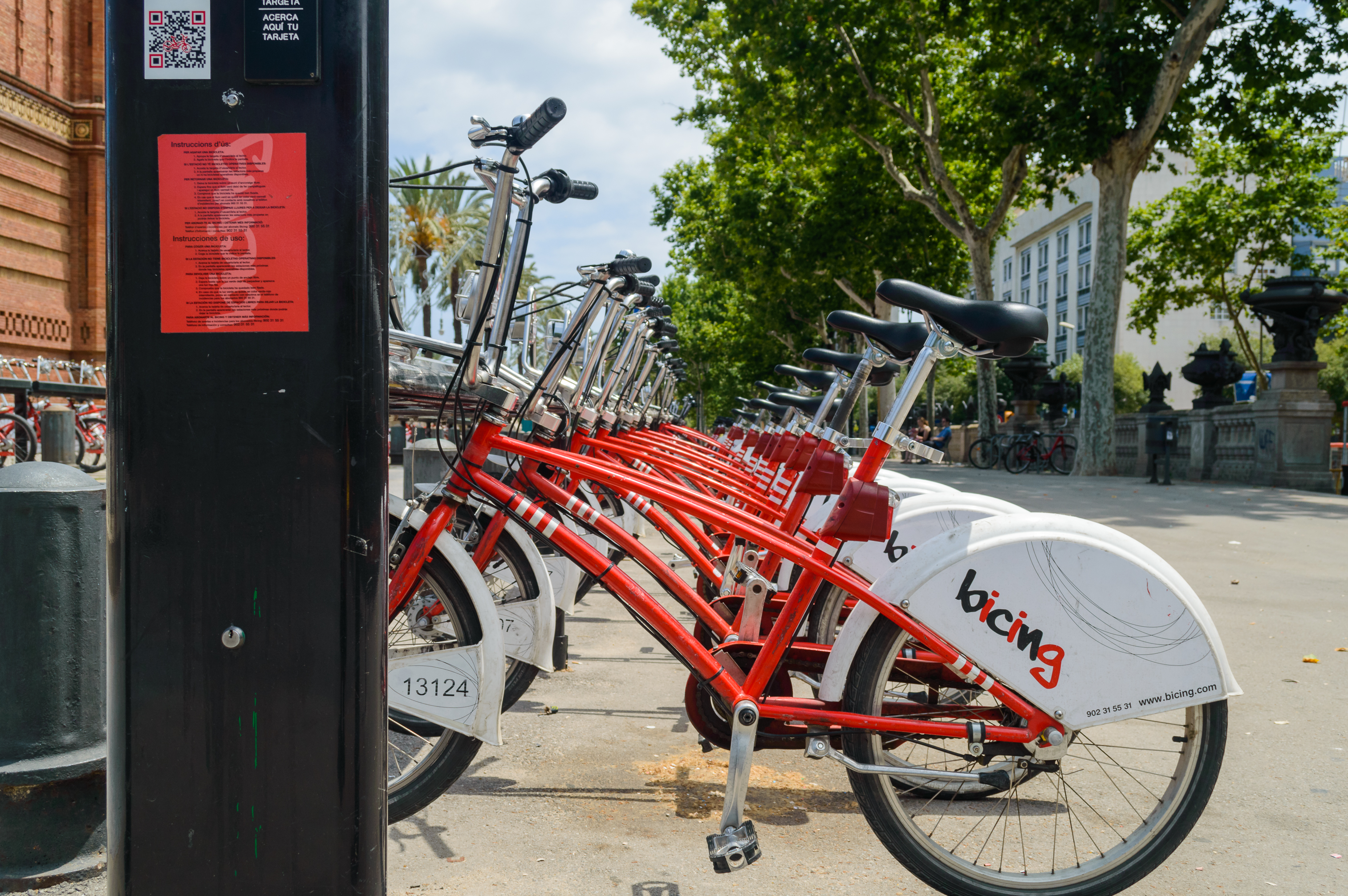 Красные велосипеды для аренды, припаркованные в Барселоне