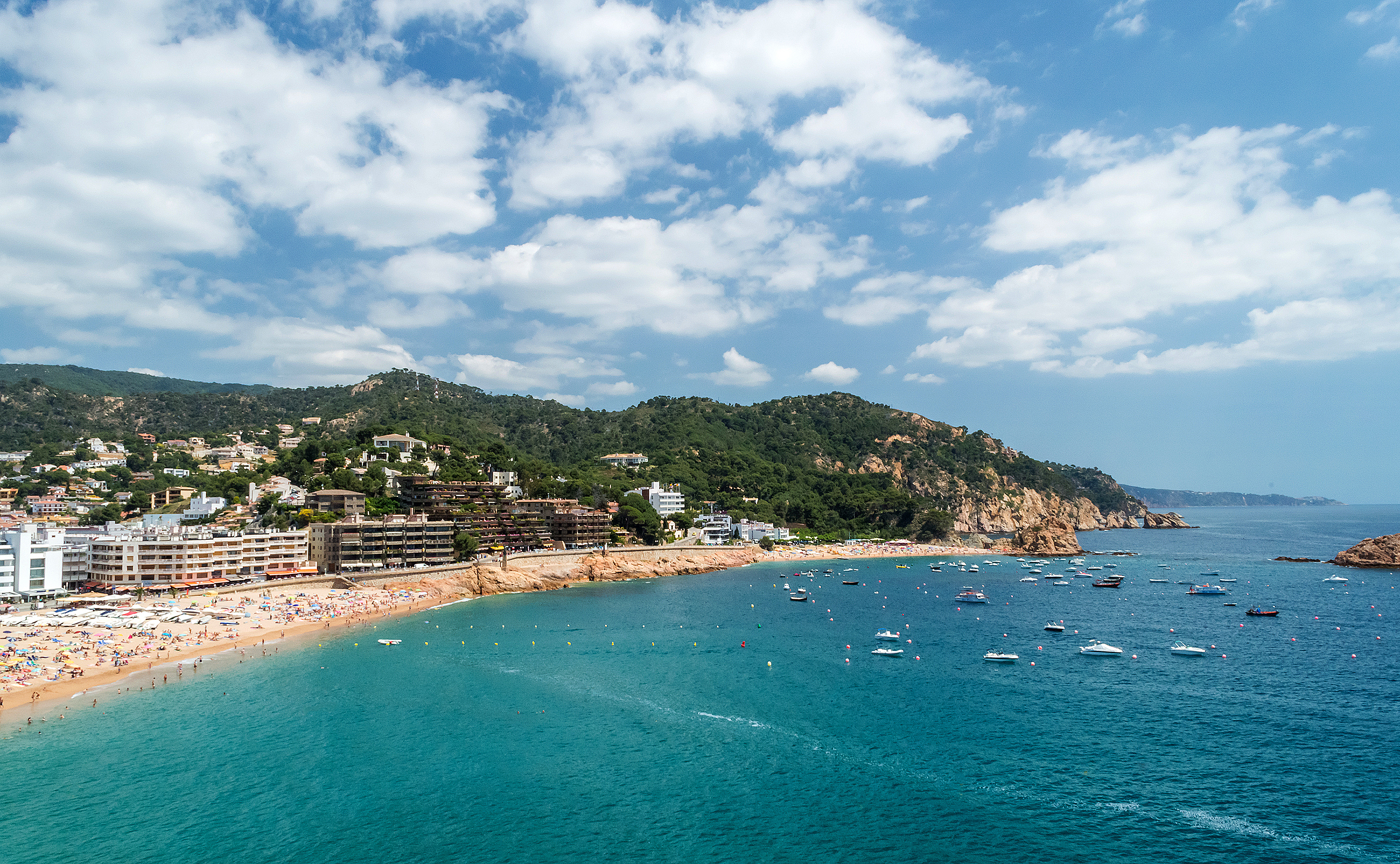 Это потрясающее аэрофото захватывает живописный прибрежный город Тосса-де-Мар, расположенный вдоль Коста Бравы в Каталонии, Испании. Сцена раскрывается под ярко-синим небом с пушистыми белыми облаками, мягкий естественный свет освещает всю местность. Бирюзовая вода Медитерранея ласково плескается о заполненный солнечными зонтиками и загоральщиками песчаный пляж, а множество яхт и лодок спокойно плавают по гладкой поверхности. На берегу современные отели и традиционные здания гармонично вплетены в склонистую местность, окруженную зеленью и скалистыми уступами, которые обрамляют эту идеальную локацию. Композиция демонстрирует широкий панорамный вид сверху, позволяя оценить как бурное переднее пространство с людьми, так и спокойный масштаб морской глади.