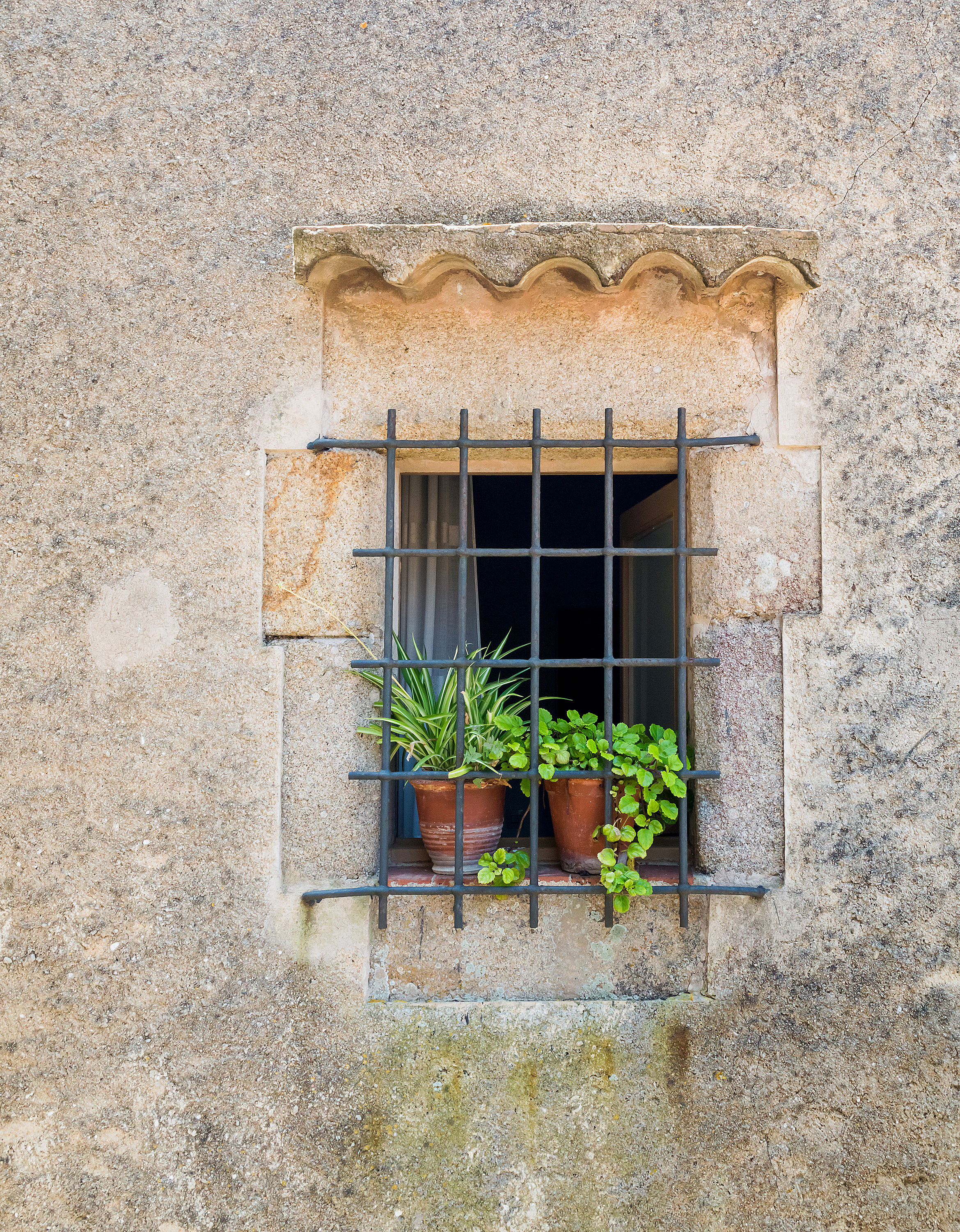 Композиция сосредоточена на окне, который симметрично обрамлен, привлекая внимание к тщательно размещенным горшкам с растениями. Тёплые тона терракотовых горшков дополняют холодный серый оттенок каменной стены, в то время как темные железные прутья служат сильной визуальной опорой. Мягкий рассеянный дневной свет усиливает текстуры и цвета без резких теней, что указывает на спокойный дневной сценарий.