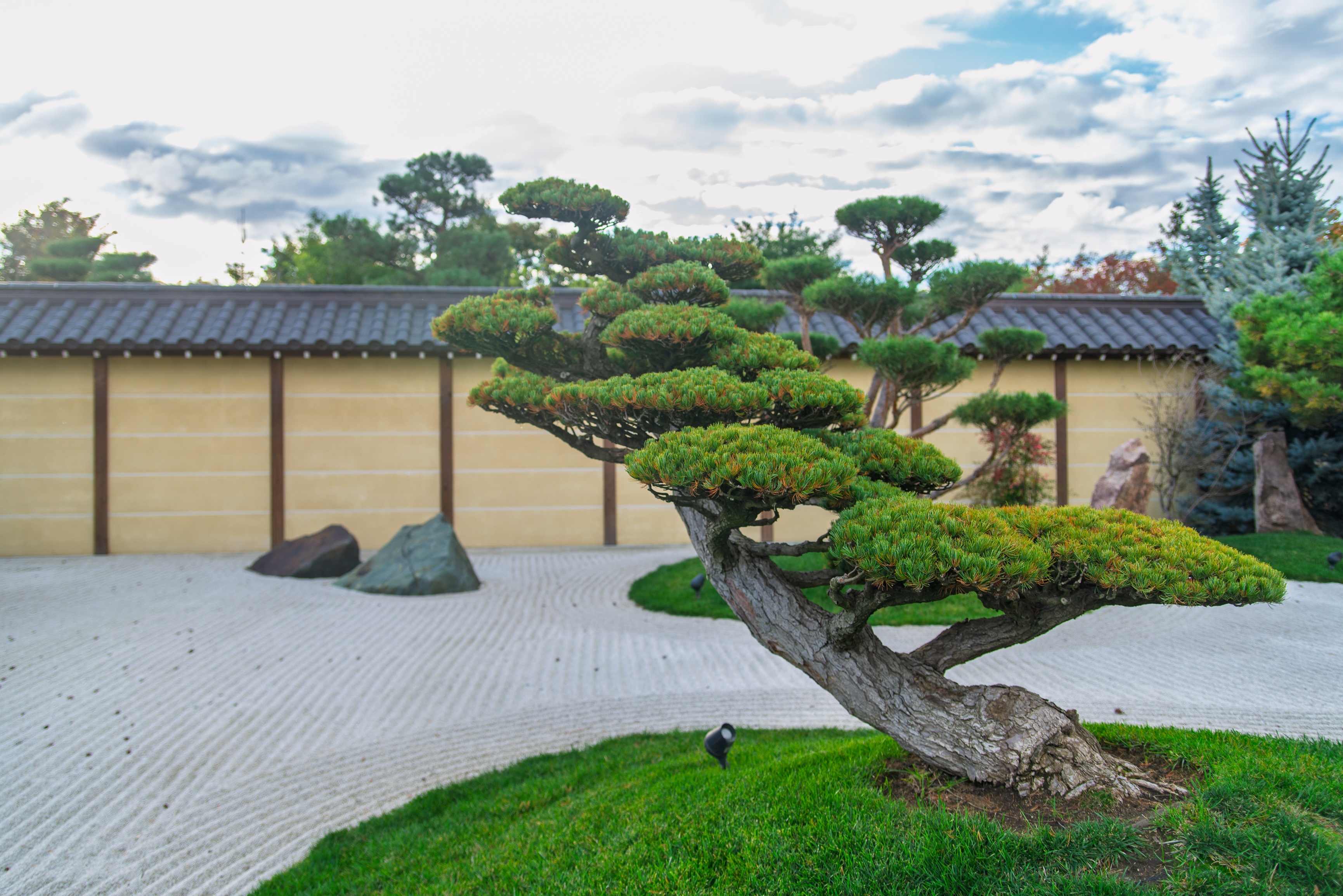 На изображении представлен японский дзен-сад, расположенный в парке Галицкого в Краснодаре, где в центре композиции возвышается изящно подстриженное дерево бонсай. Сцена снимается в дневное время, когда мягкий свет рассеянного облачного неба создает спокойную и умиротворяющую атмосферу. Бонсай, с его изогнутым стволом и плотными, аккуратно уложенными ветвями, выглядит как произведение искусства, воплощающее идеи японской садовой культуры. На заднем плане виден характерный для дзен-садов элемент — ровная, расчесанная поверхность белого гравия, символизирующая воду или путь, а также желтые стены с традиционной черепичной крышей, которые придают сцене аутентичный восточный колорит. Вокруг бонсая — аккуратная зеленая лужайка, контрастирующая с серым гравием, а также несколько декоративных камней, добавляющих сцене баланс и гармонию. Вдалеке виднеются другие деревья и кустарники, создающие глубину пространства и ощущение уединения.