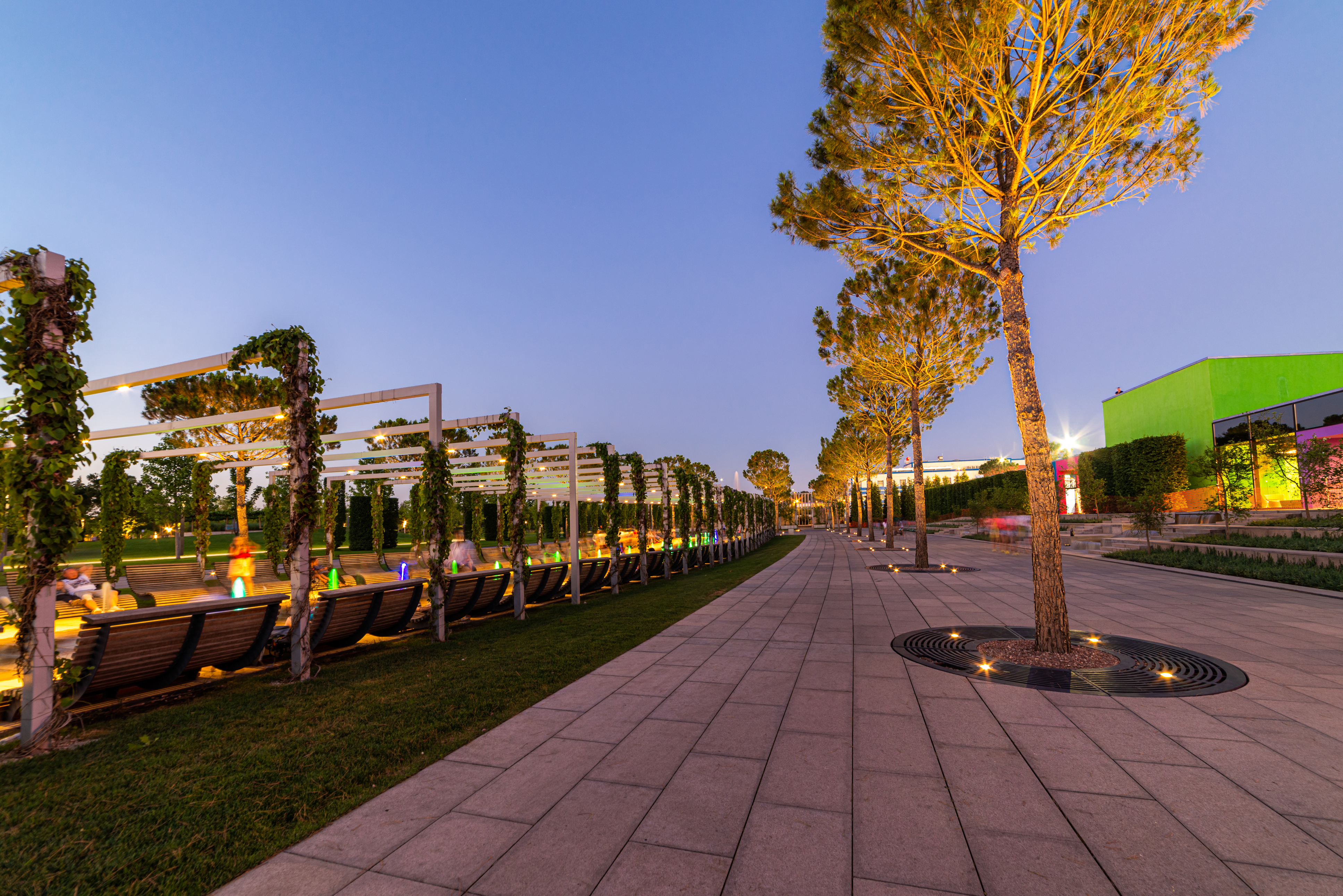 Это завораживающее изображение запечатлевает спокойную прогулку по современному городскому парку, где современная архитектура гармонично сочетается с природными элементами. Сцена разворачивается под вечерним небом, переходящим от мягких голубых тонов к теплым золотистым оттенкам у горизонта, создавая спокойное освещение для аккуратных лужаек и мощеных троп. Ряды высоких деревьев с подсветкой вокруг стволов выстраиваются вдоль дорожки, а элегантные беседки, покрытые зеленью, предлагают затенённые места для отдыха. Архитектура включает чистые линии и минималистичные формы — в частности, яркое зелёное здание на заднем плане, контрастирующее с землистыми оттенками каменной плитки и естественных текстур. Композиция использует симметрию и перспективу, чтобы направлять зрителя вдоль тропы к горизонту, усиленную техникой длительной выдержки, которая добавляет динамику светам и деревьям через легкое размытие движения.