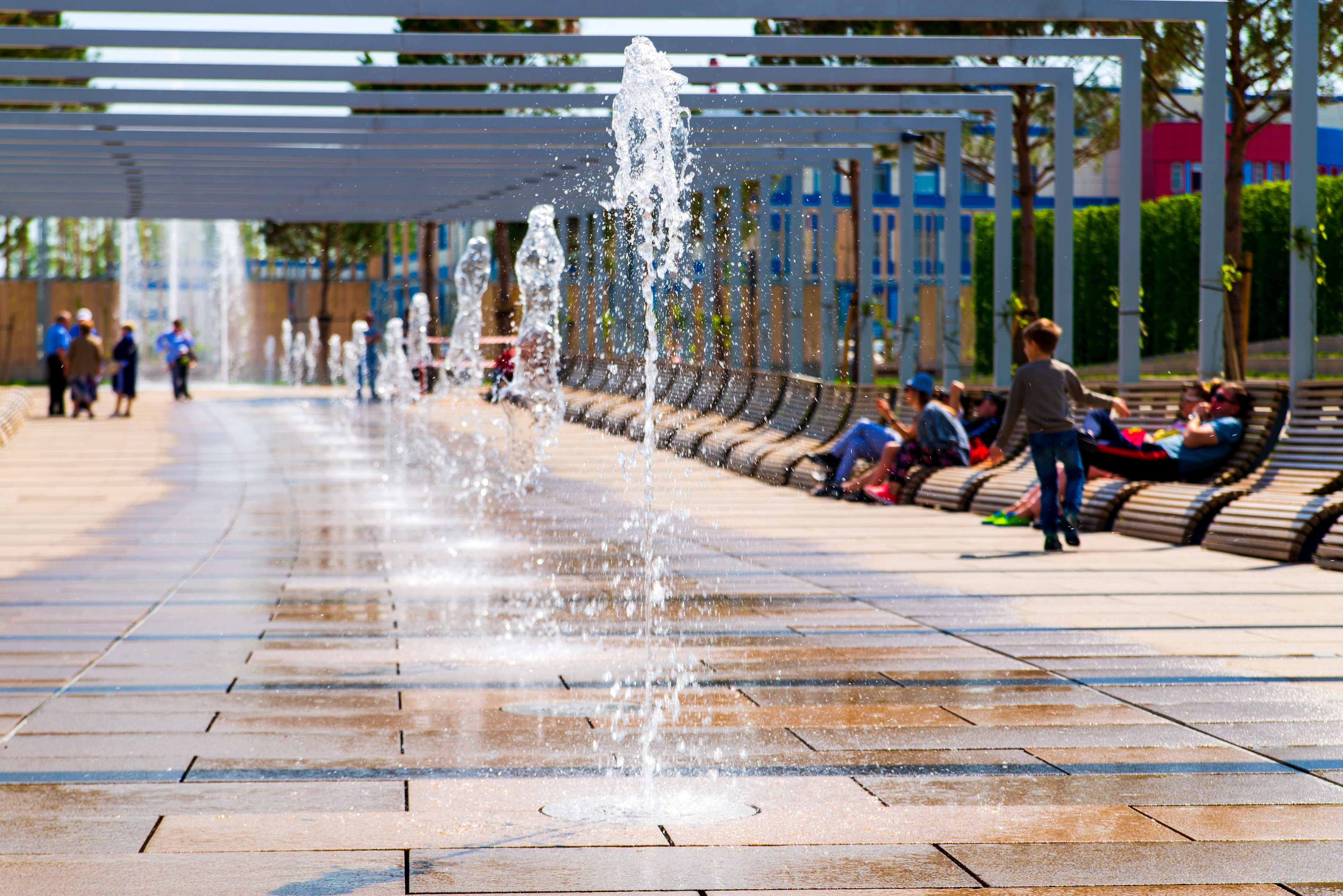Эта живая сцена запечатлела современный городской парк, где фонтаны служат центральным элементом, создавая игривые брызги, отражающие солнце на мокром тротуаре. Архитектурная конструкция над головой состоит из гладких металлических балок и стеклянных панелей, сочетающих современный дизайн с природными элементами, такими как деревья и кустарники на заднем плане. Посетители всех возрастов наслаждаются пространством—некоторые отдыхают на деревянных скамьях в тени, другие бегают по водяным струям или стоят рядом с потоками воды. Яркое голубое небо и сильный дневной свет усиливают яркость цветов: от теплых оттенков каменных плит до холодных тонов водяных струй. Это идеальное изображение летнего отдыха в городской среде, где архитектура, природа и человеческая активность сосуществуют гармонично.