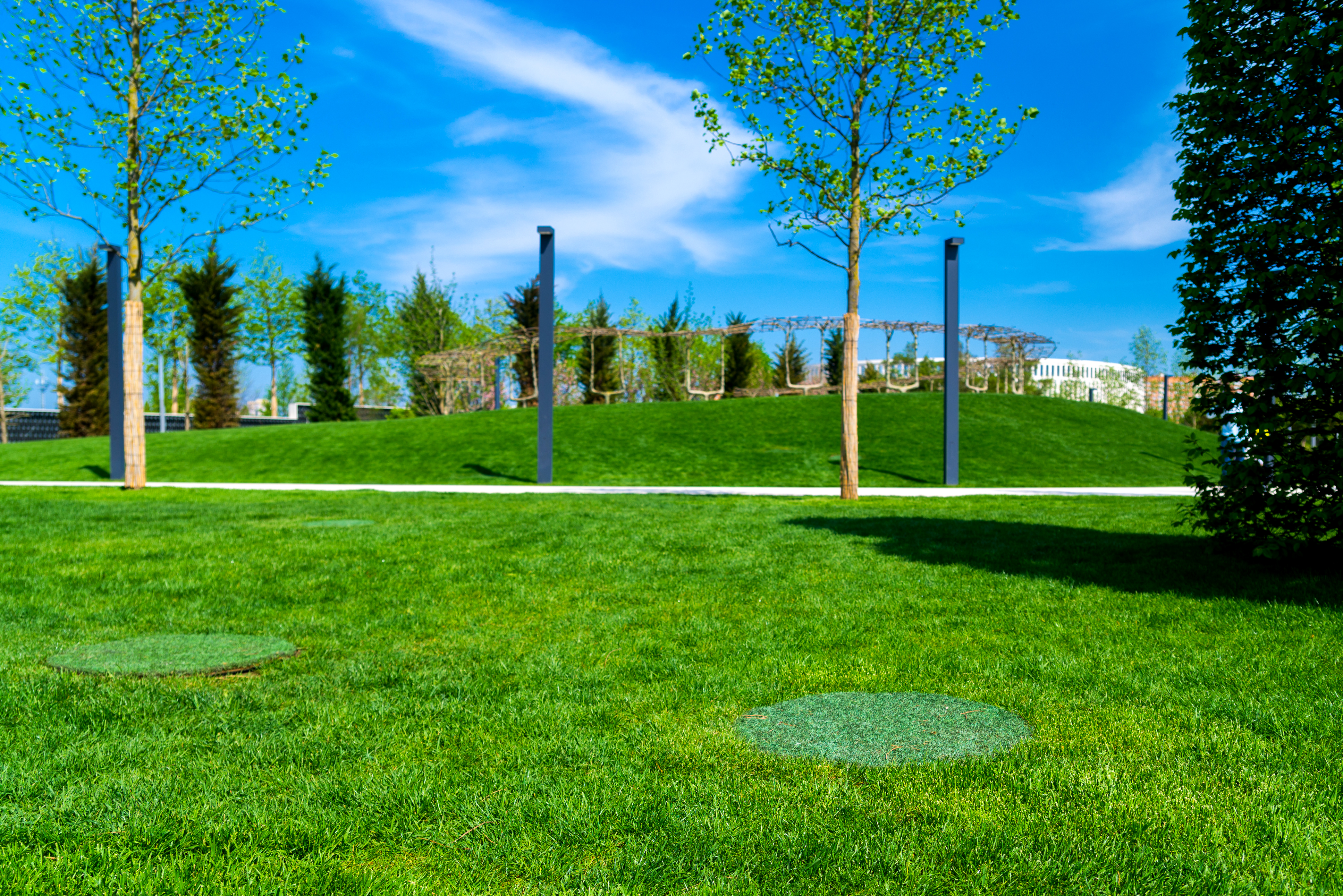 This modern park offers a serene escape within an urban setting, characterized by its meticulously maintained green grass and vibrant blue sky. The landscape features young trees strategically placed to enhance the natural aesthetic while providing shade and visual rhythm. Architectural elements, including sleek vertical steel structures and paved pathways, harmonize with the organic forms of nature. In the background, a gently sloping hill supports an intricate pergola structure, suggesting recreational or artistic use. The scene is bathed in bright, direct sunlight that accentuates vivid green textures and casts sharp shadows from the trees. This composition balances man-made structures with natural elements to create a tranquil yet dynamic environment.