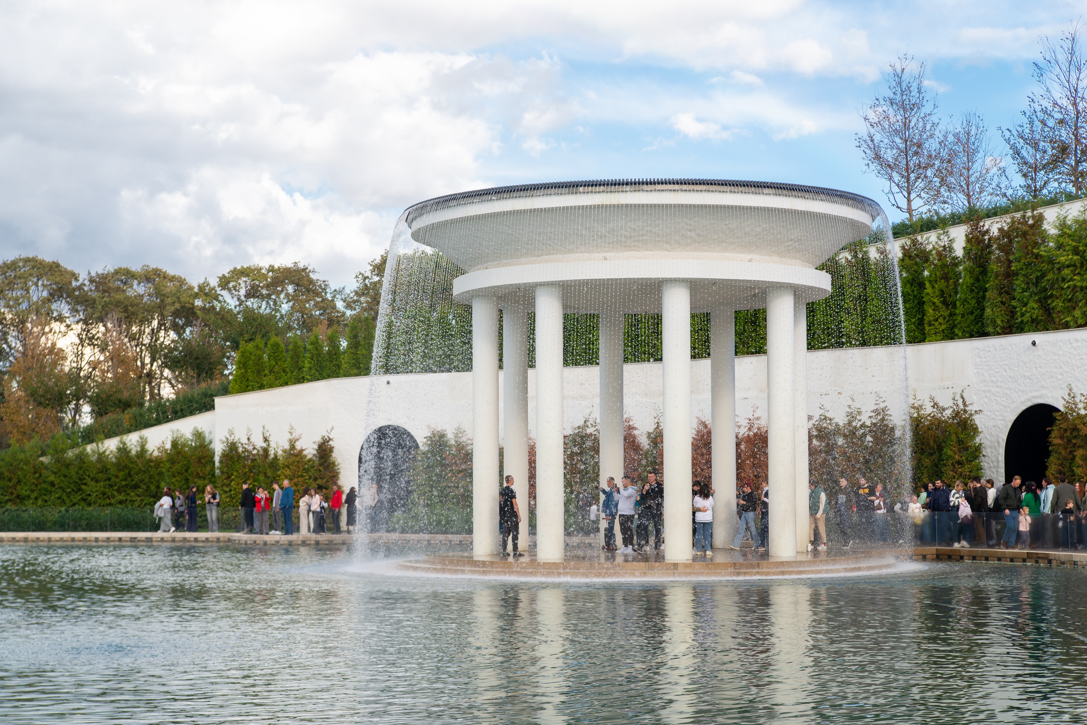 Изображение запечатлело живописную сцену в современно спроектированном парке или общественном пространстве, где центральное место занимает впечатляющий фонтан. Фонтан представляет собой архитектурное сооружение с плоской крышей, поддерживаемой колоннами, и окруженное водой. Особый шарм ему придает каскадный водопад, низвергающийся с верхнего уровня, создавая завораживающий эффект.