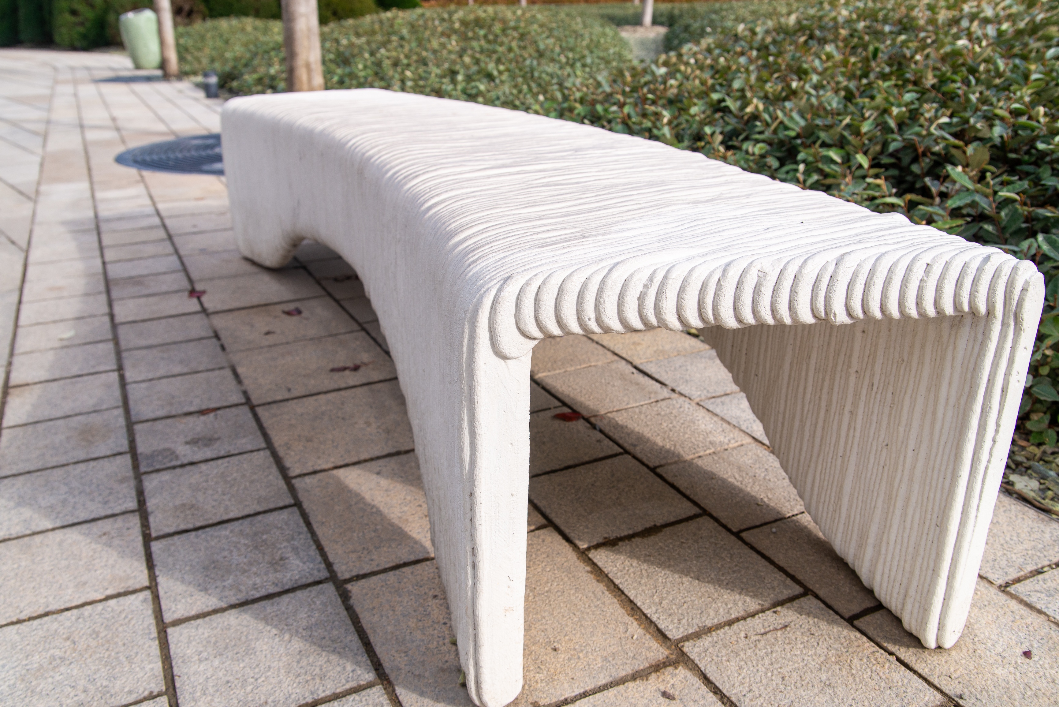 Композиция подчёркивает взаимодействие между геометрией человека-создателя и органическими формами — от повторяющейся волнистой текстуры на поверхности скамейки до нерегулярных форм растительности позади. Освещение мягкое и рассеянное, предполагающее вечернее солнце, пробивающееся через деревья или облака, что усиливает тактильную природу материала без резких бликов. Этот тонкий эффект света и тени подчеркивает как гладкость бетоноподобного покрытия, так и шероховатую текстуру окружающей растительности.