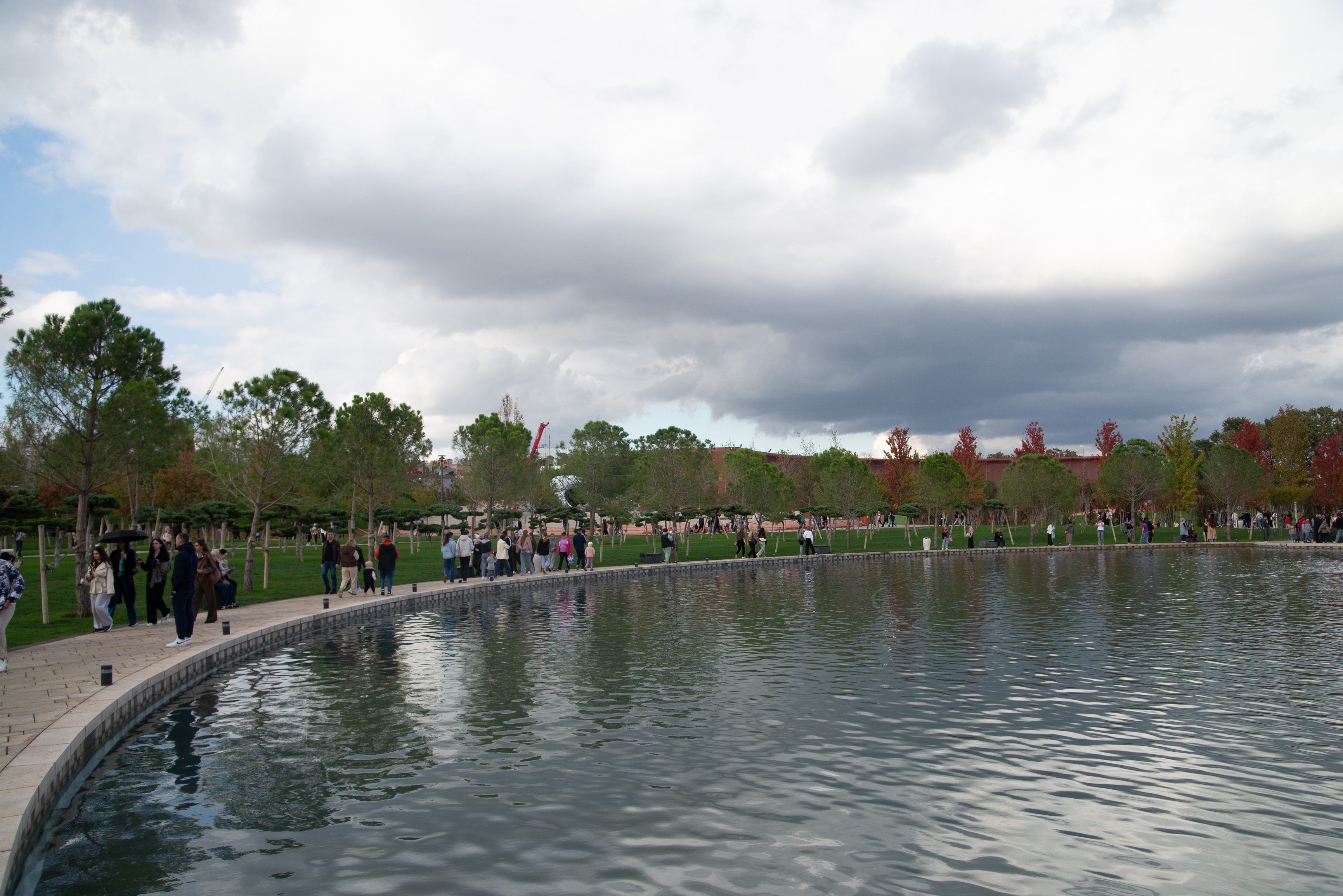 The central feature of the photograph is a majestic pond, its surface acting like a mirror, reflecting the sky and the verdant shoreline above. Gentle ripples on the water add dynamism to the image, enlivening the static landscape. Along the pond's edge, an elegant tiled path meanders, where people are strolling.