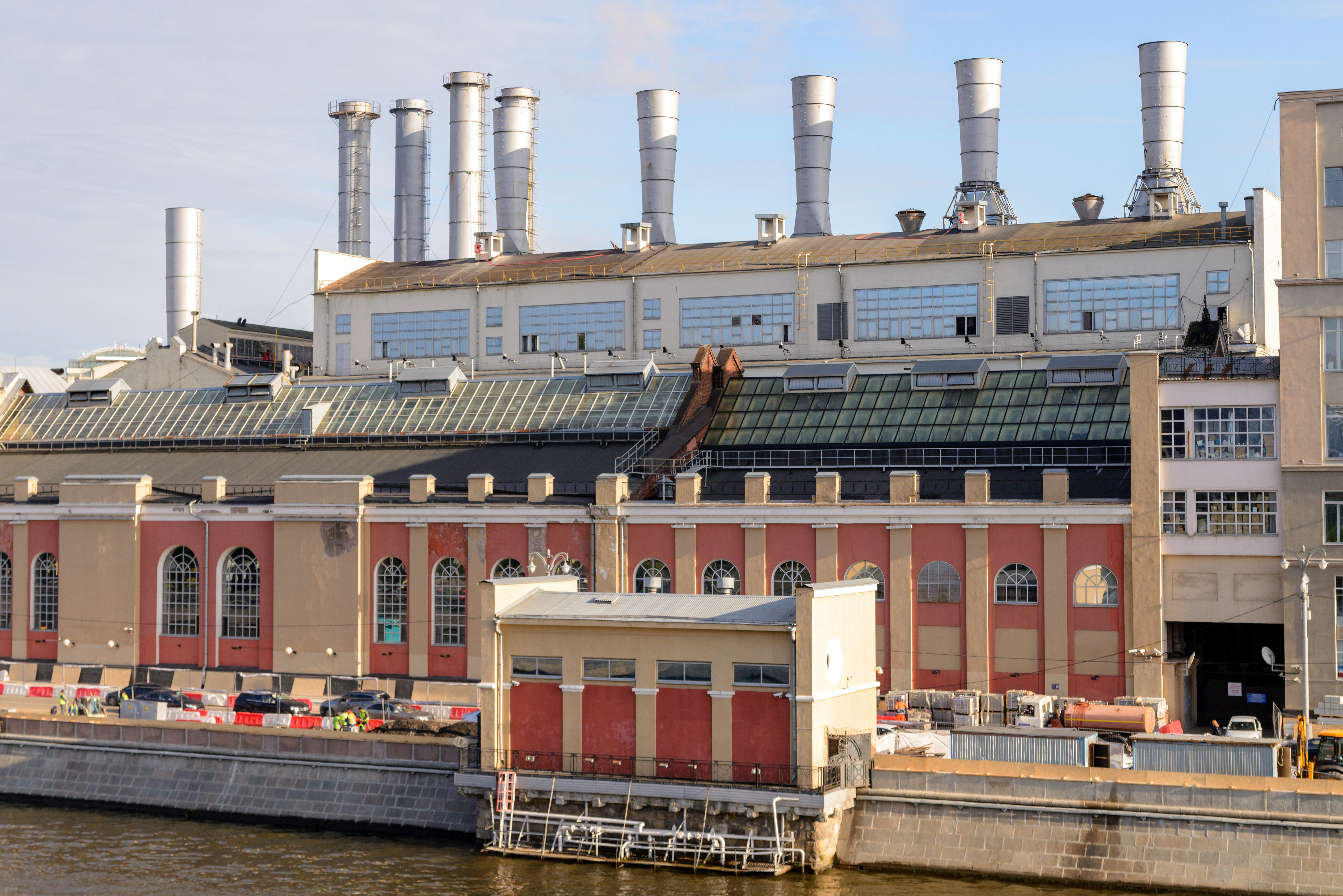 На этом впечатляющем снимке изображена современная промышленная электростанция, расположенная внушительно на набережной Москвы-реки, демонстрируя свою архитектурную величие на фоне ясного голубого неба. Структура с высокими трубами и обширной стеклянной крышей сочетает в себе функциональное инженерное решение и городской дизайн. Построенная в эпоху, когда классические красные кирпичные фасады сочетаются с современными материалами — сталью и бетоном — она служит свидетельством промышленного прогресса внутри исторической городской среды.